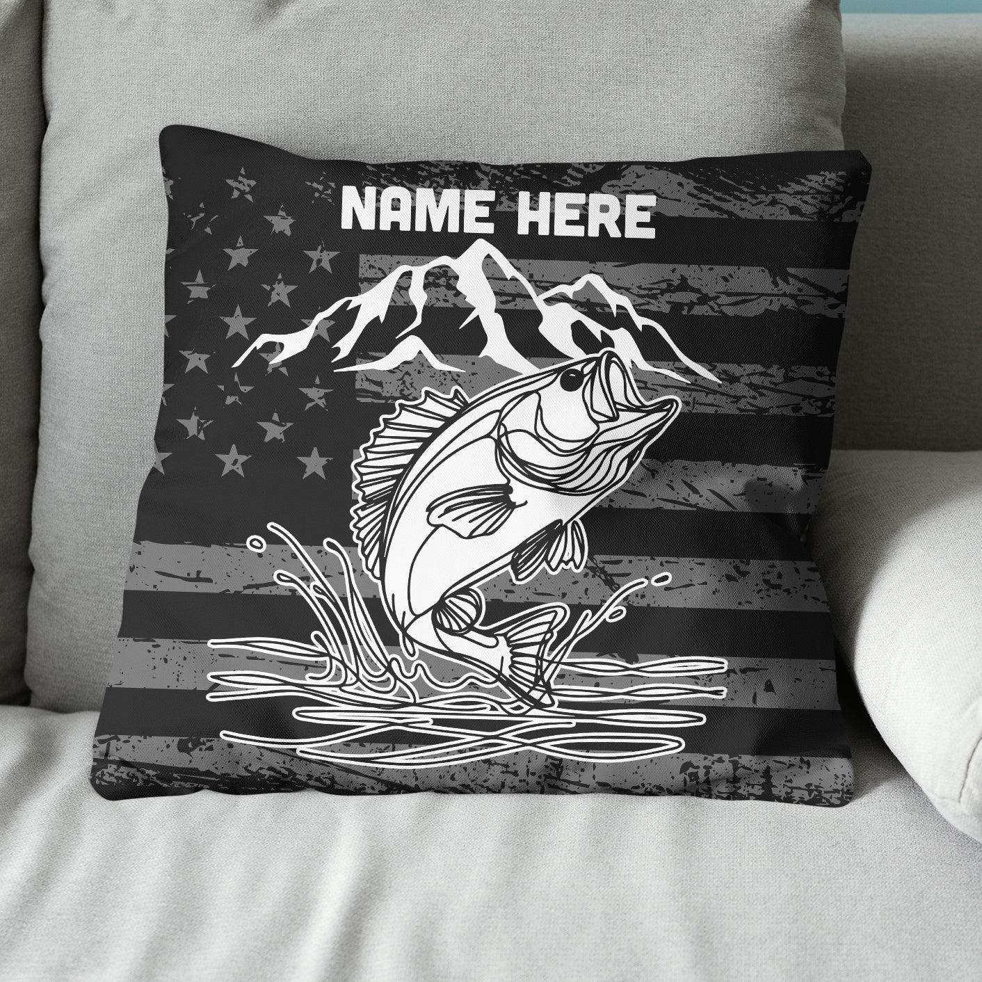 Personalized black American flag bass fishing custom name Canvas, Linen Throw Pillow NQS7027