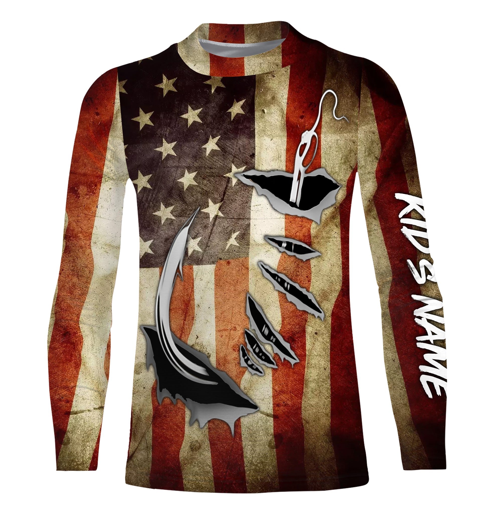 Fish Hook Vintage American Flag Custom Long Sleeve Fishing Shirts, Personalized Patriotic Fishing Gifts FEB21 - IPHW661
