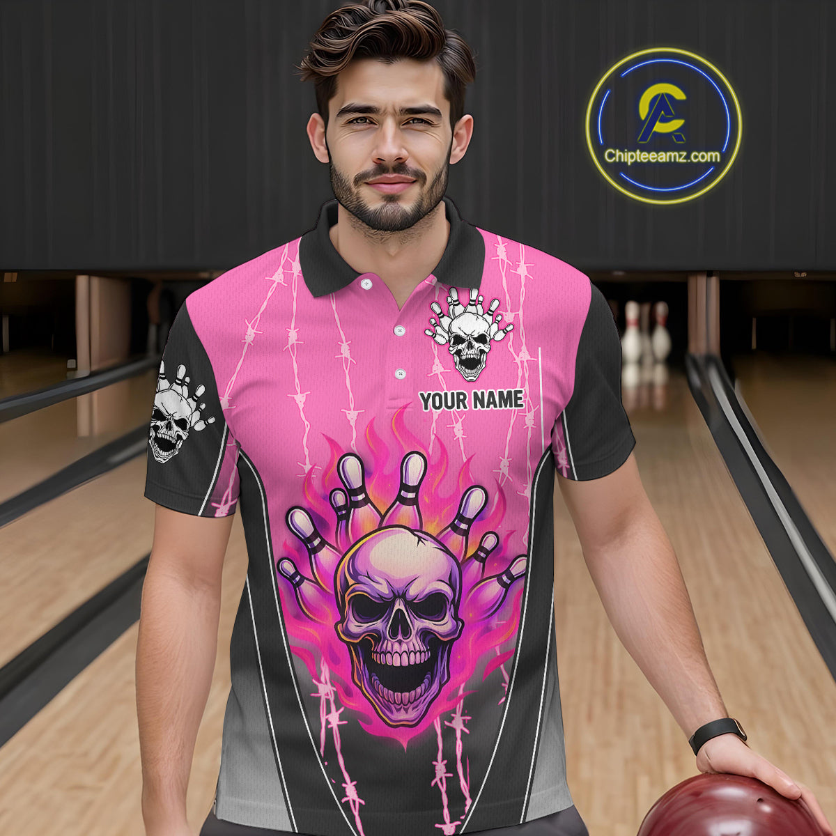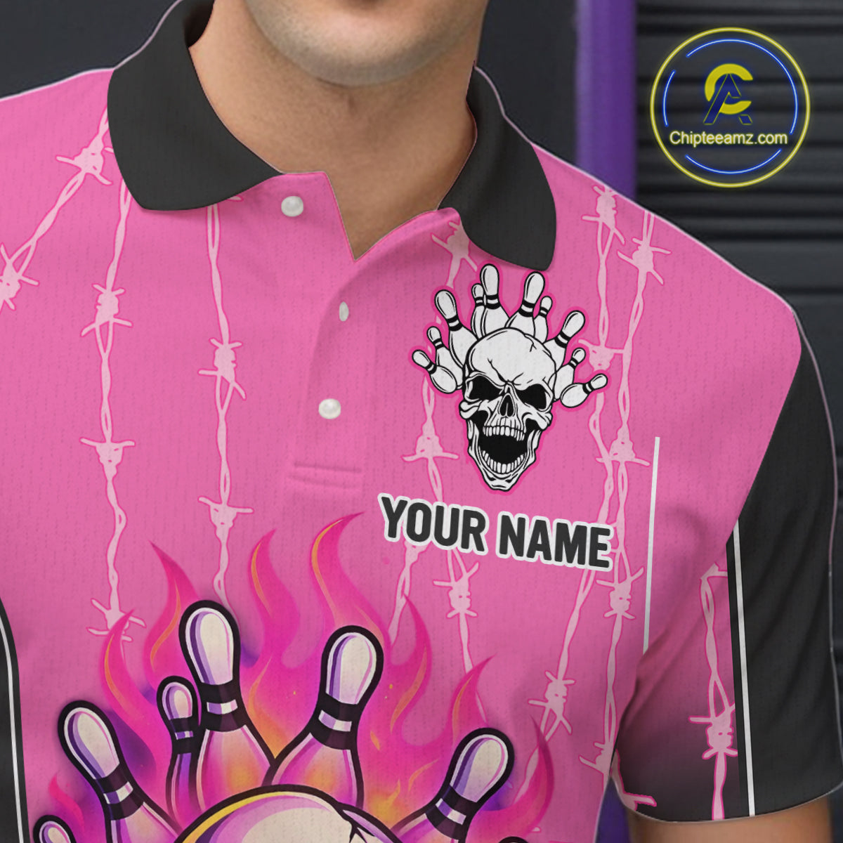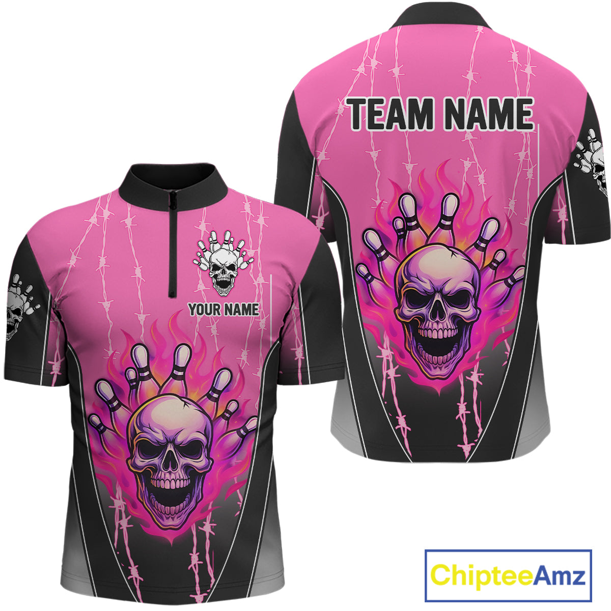 Black and pink flame skull Bowling Polo, 1/4 Zip Shirt for men Custom Team Bowling League Jersey NQS10203