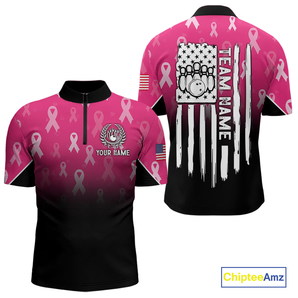Custom American flag patriotic Pink ribbon breast cancer bowling shirt for men bowling team jersey NQS10413