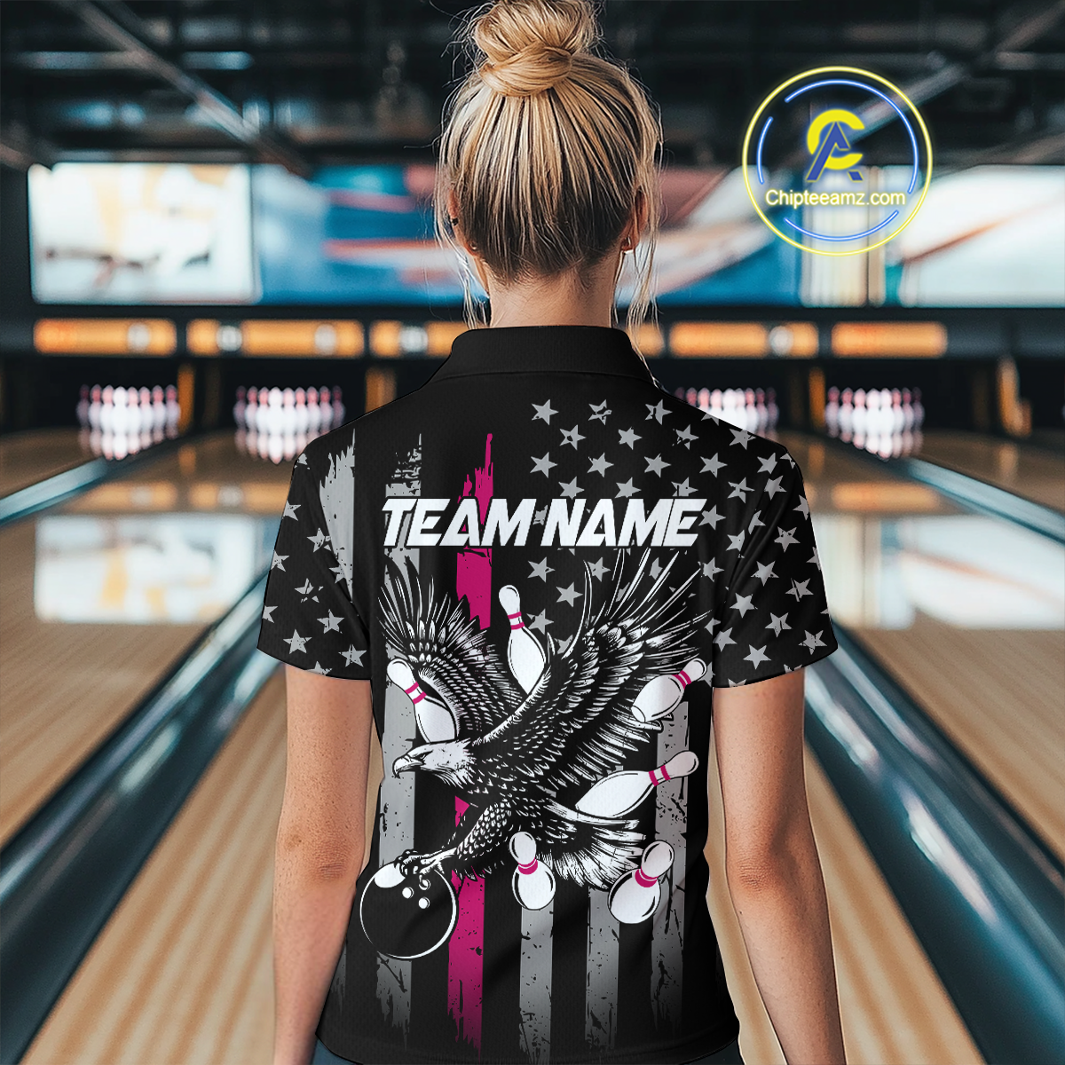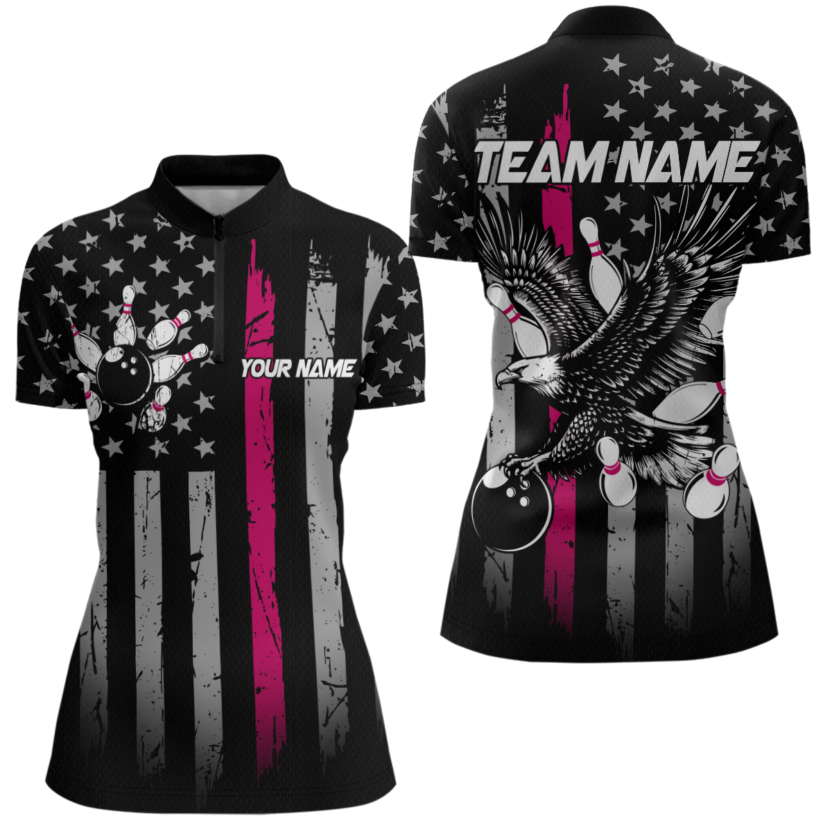 Custom Pink US Flag Eagle Bowling Jersey for Women Bowling Uniform Polo & 1/4 Zip Bowling Team Shirts HNT119