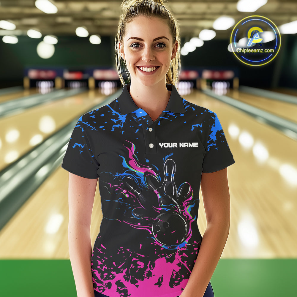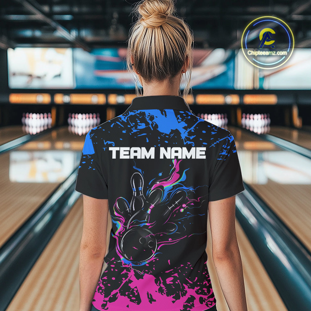 Personalized Black, Blue and Pink Bowling Shirts For Women, Bowling Ball & Pins Bowling Team Shirts NQS10742