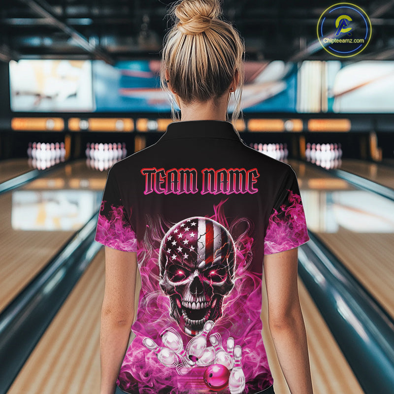 Pink Flame Smoke American Flag Eagle Skull Women Bowling Shirt Custom Patriotic Bowling Team Jersey NQS10527