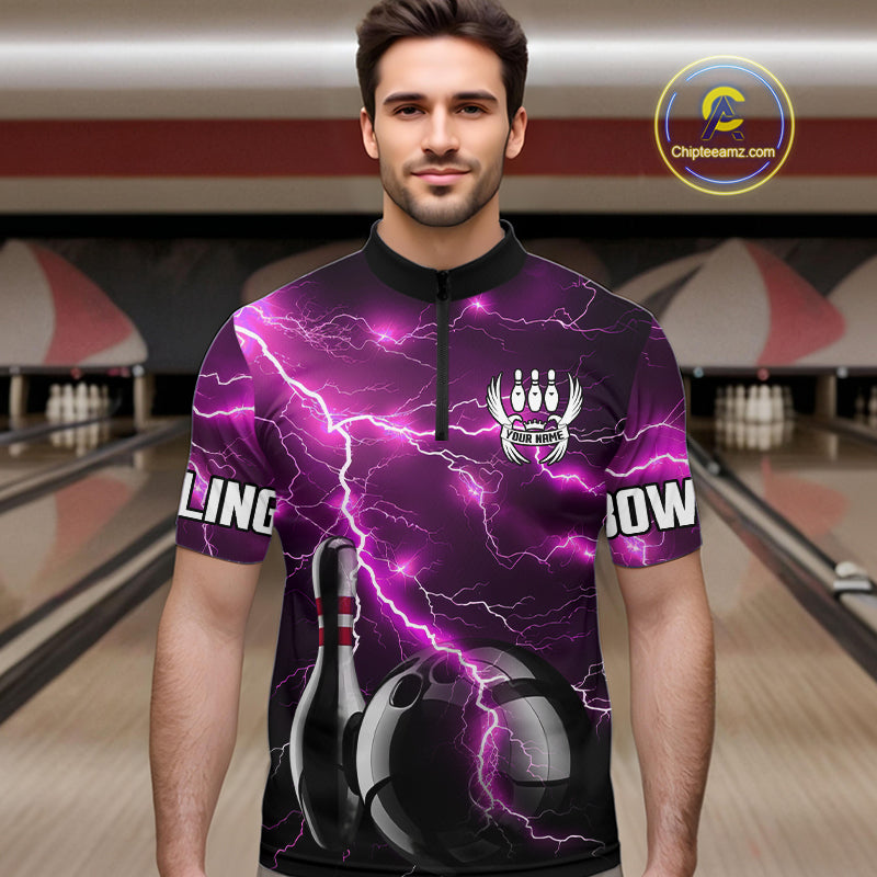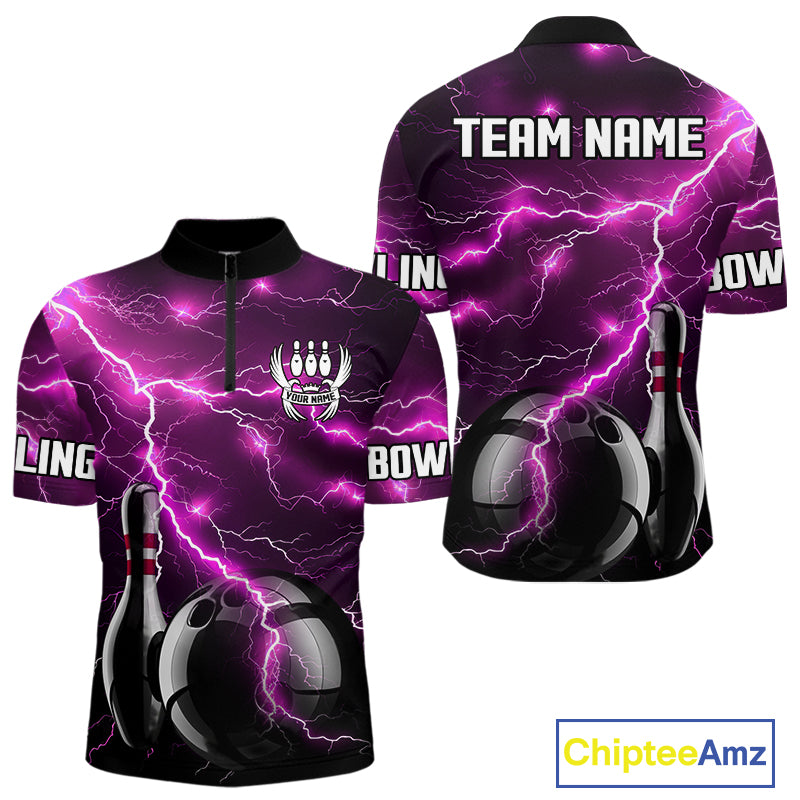 Pink Lightning Thunder Black Bowling Polo, Quarter zip Shirt for Men custom bowling team jerseys NQS10530