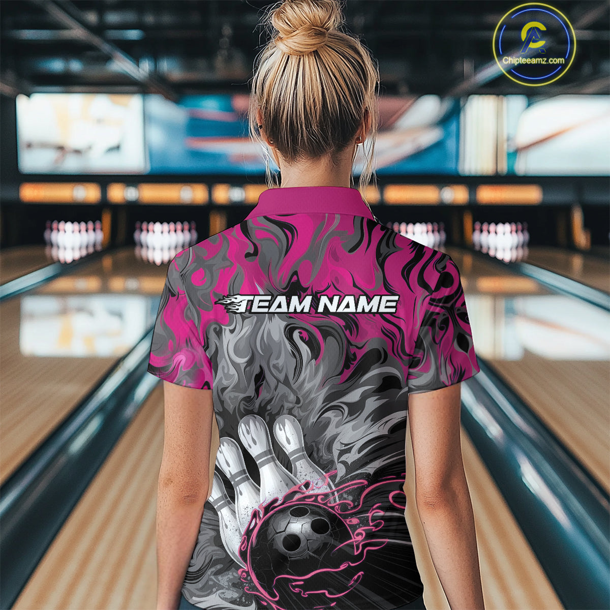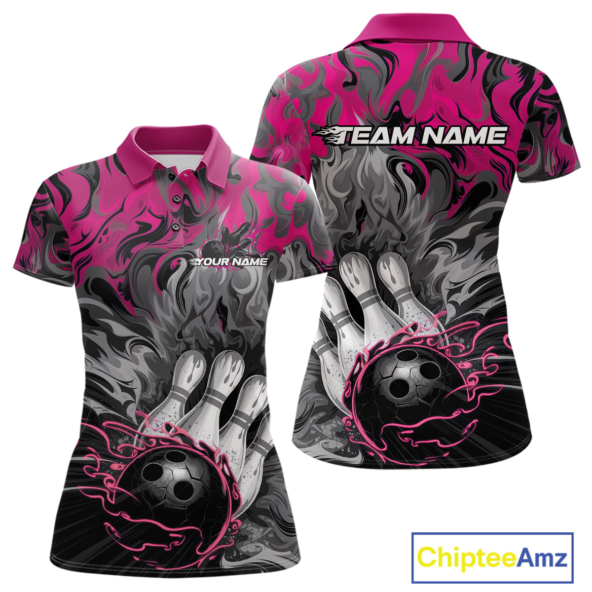 Custom Pink Flame Bowling Team Polo Shirts For Women, Fire Bowling Jerseys IPHW9561