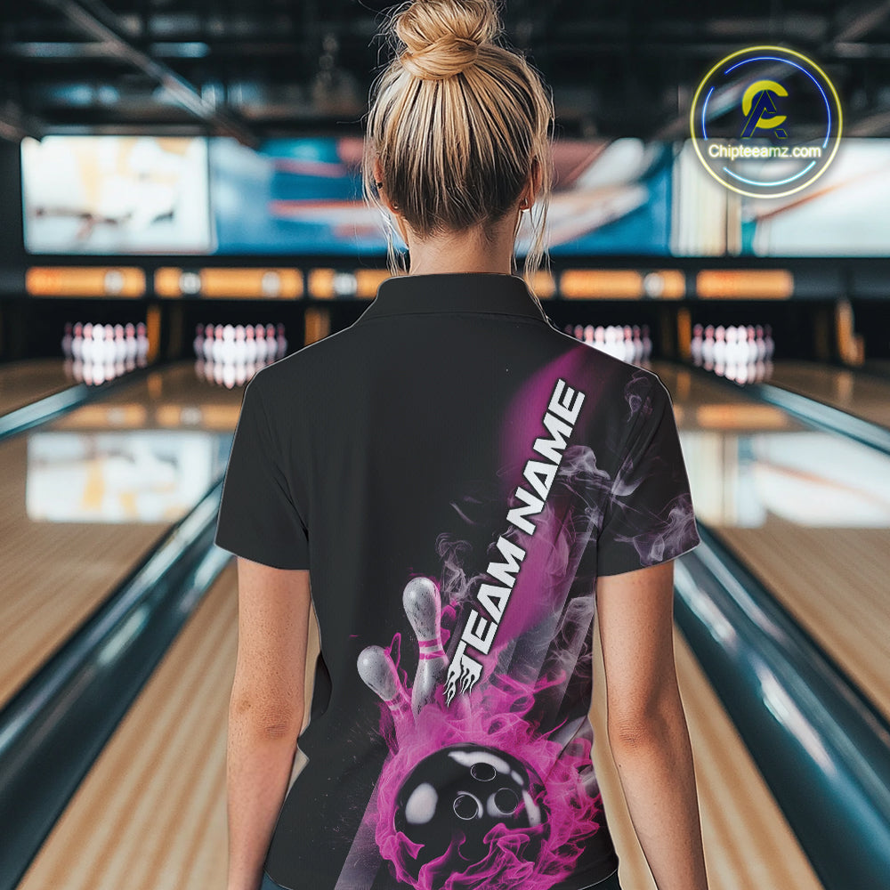 Custom Pink Flame Strike Bowling Team Polo Shirts For Women, Fire Bowling Jerseys IPHW9573