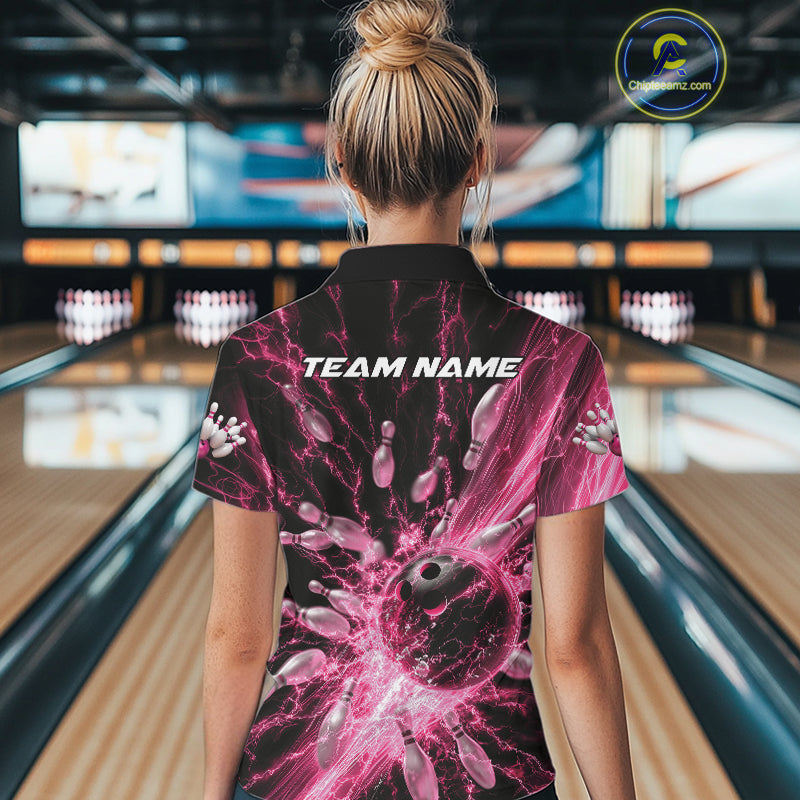 Custom Pink Thunder Lightning Bowling Team Women Polo Shirts, Bowling Jerseys IPHW9745