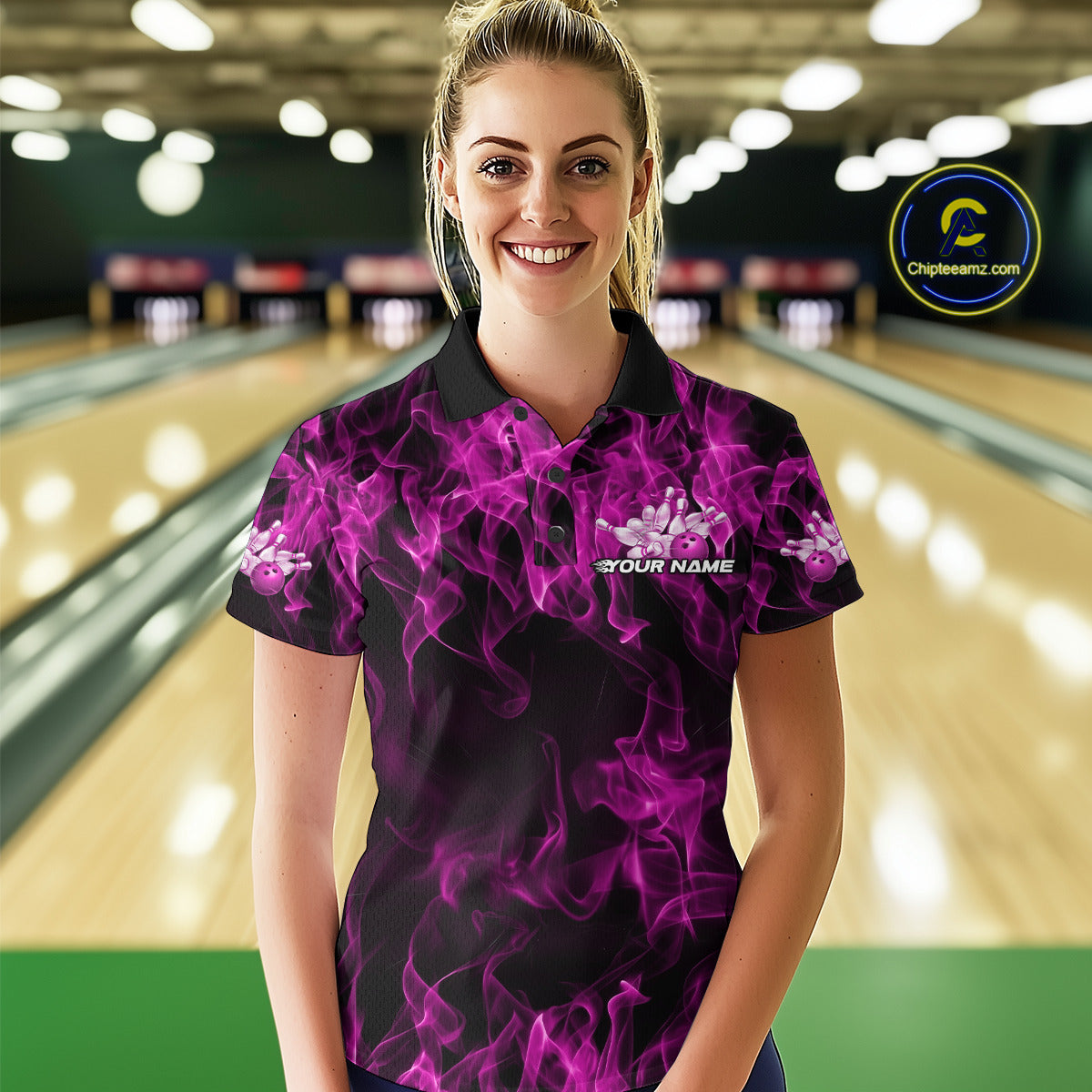 Custom Black And Pink Flame Bowling Team Women Polo Shirts, Bowling Tournament Shirt IPHW9757