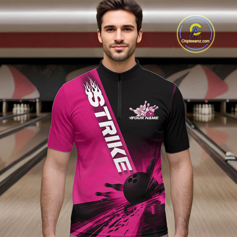 Custom Black And Pink Strike Bowling Quarter-Zip Shirts For Men, Bowling Team Uniform IPHW9554