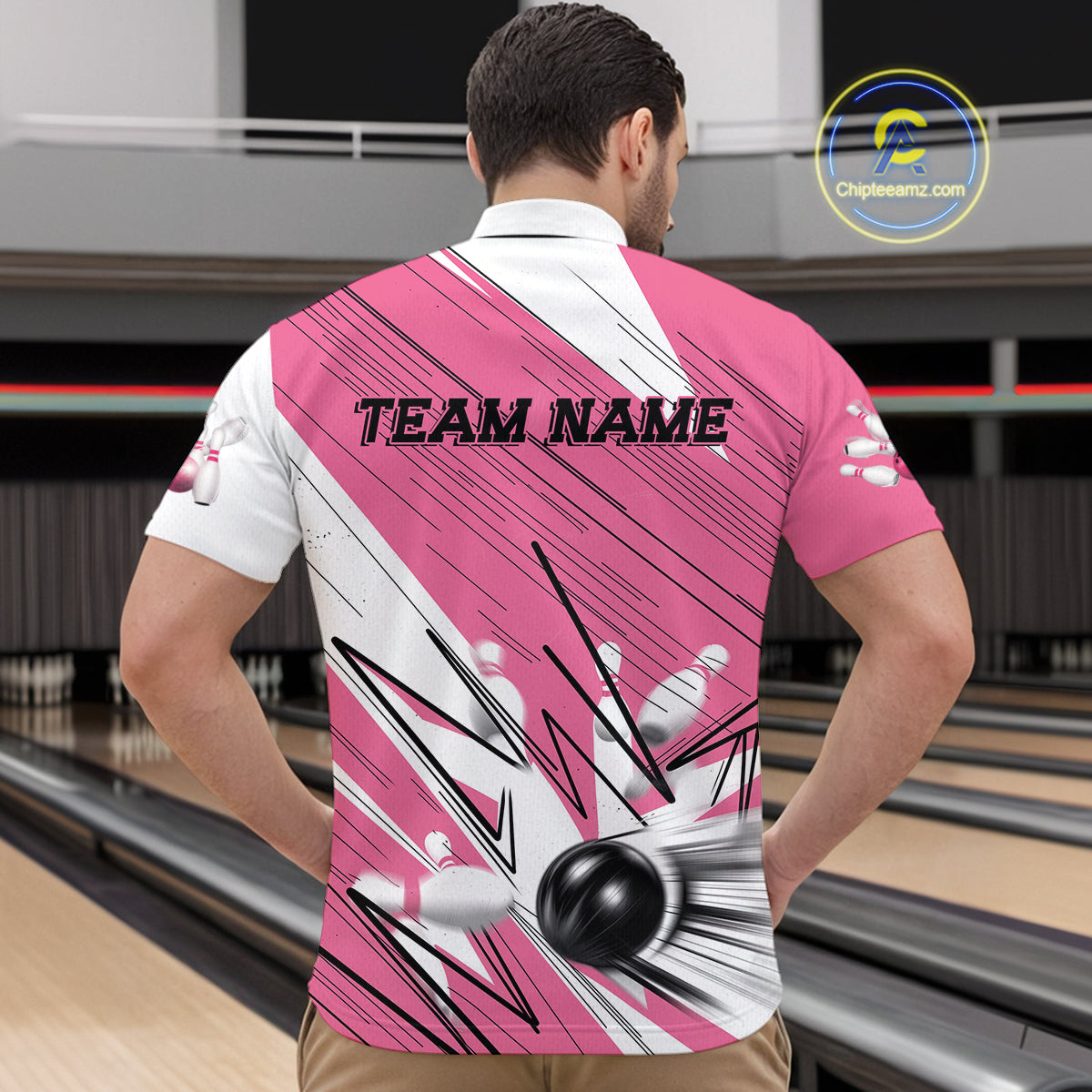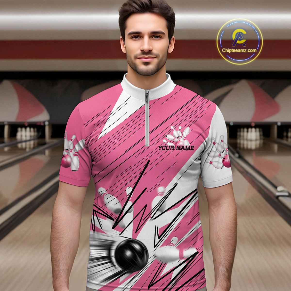 Custom White And Pink Bowling Team Men Quarter-Zip Shirts, Bowling Ball And Pins Jerseys IPHW9599