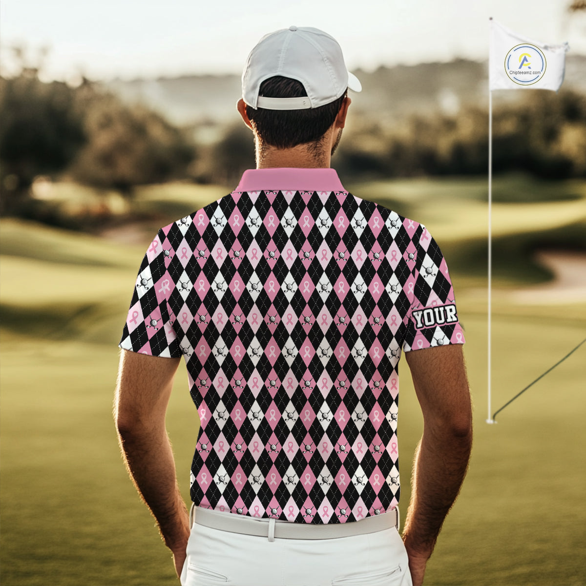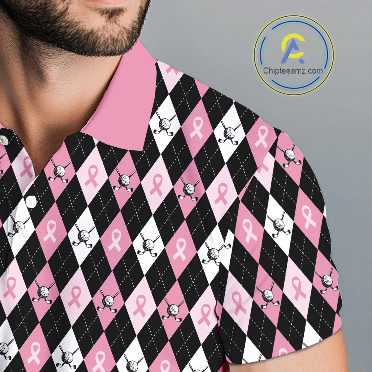 Black and Pink ribbons argyle pattern Mens golf polo shirt Custom Breast Cancer Awareness golf outfit NQS10513