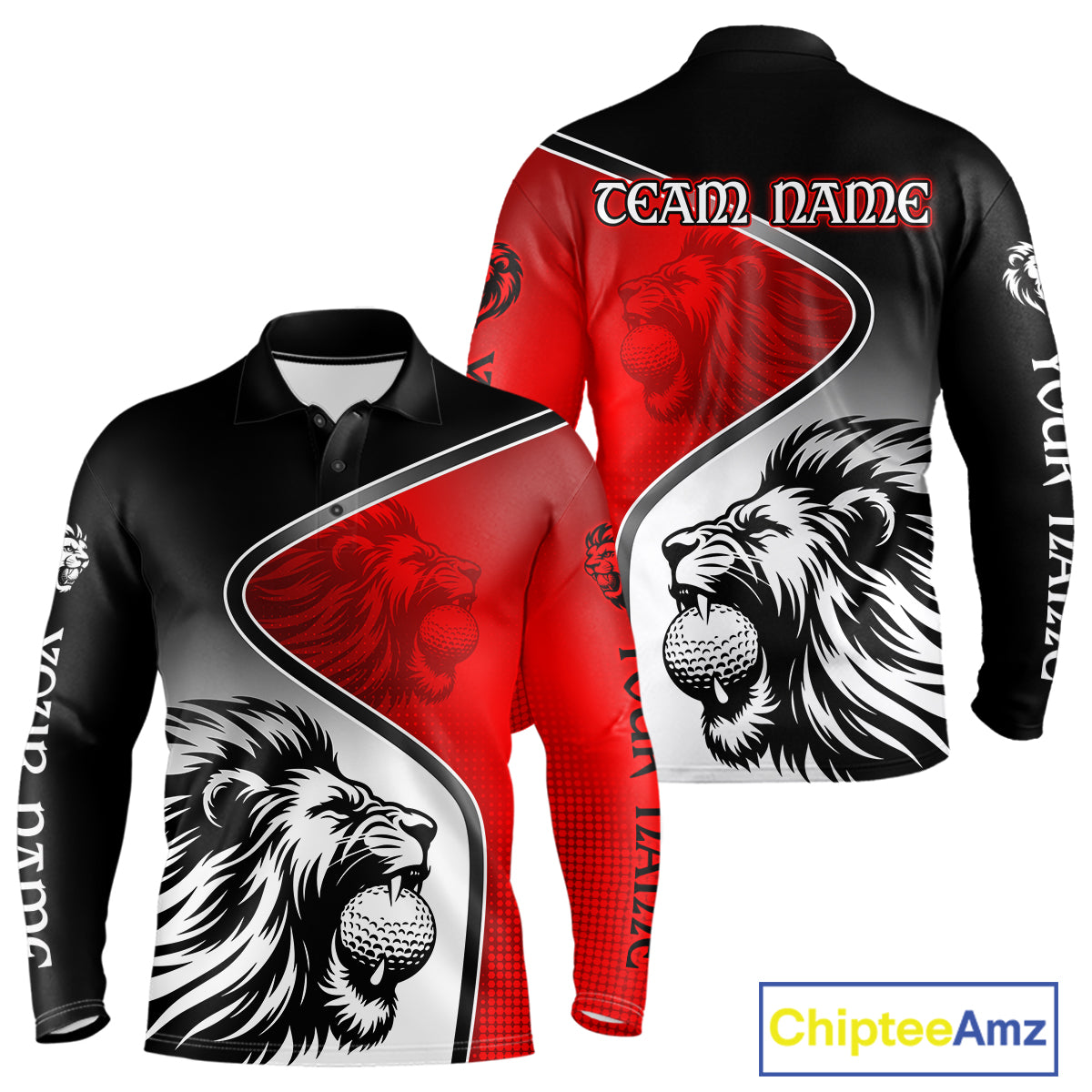 Lion Mens Golf Polo Shirt Long Sleeve Custom Red & Black Pattern Lion Golf Ball Best Golf Shirt For Men NHN0058