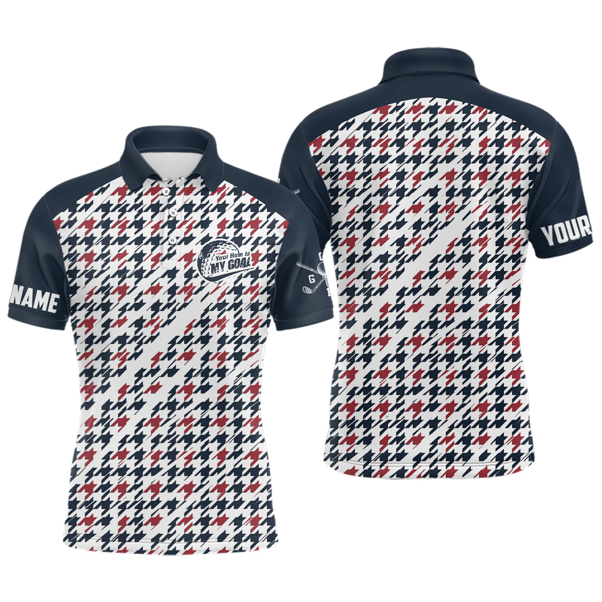 Mens golf polos shirts custom your hole is my goal blue and red pattern golf shirt, golf gifts for men NQS6517