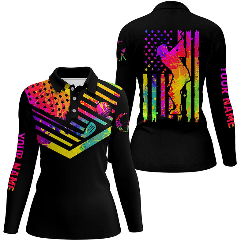 Womens golf polo shirt watercolor American flag custom name black womens golf shirt, golfer gifts NQS6004