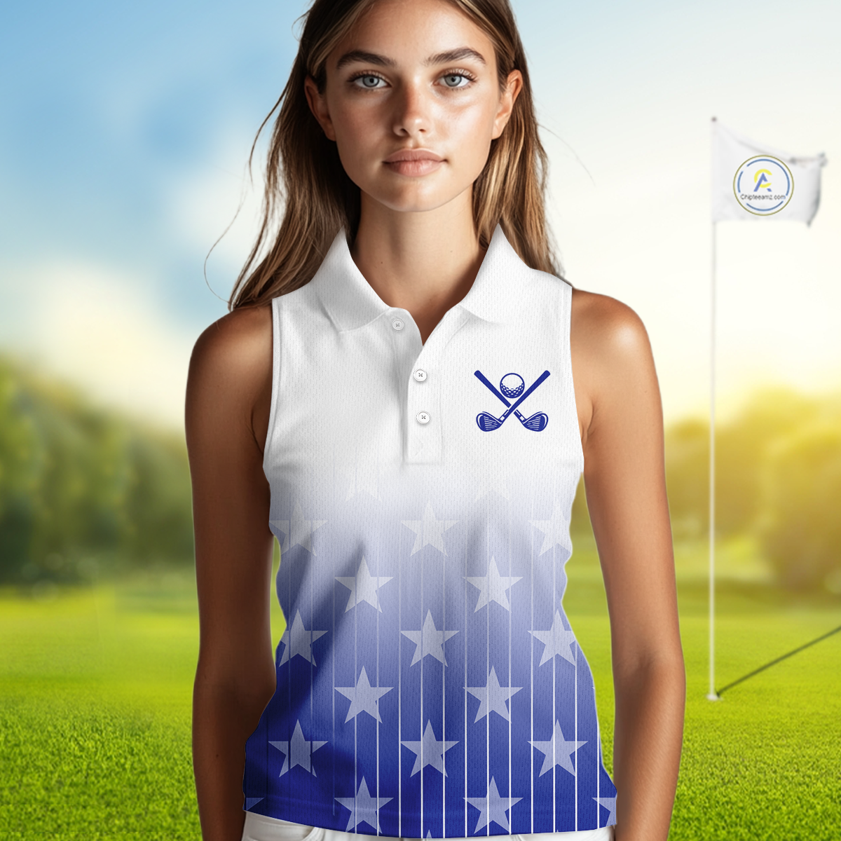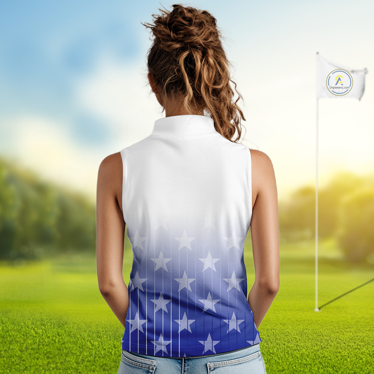 Blue stars pattern white ladies sleeveless golf polos shirts, gifts for the golfer NQS9965
