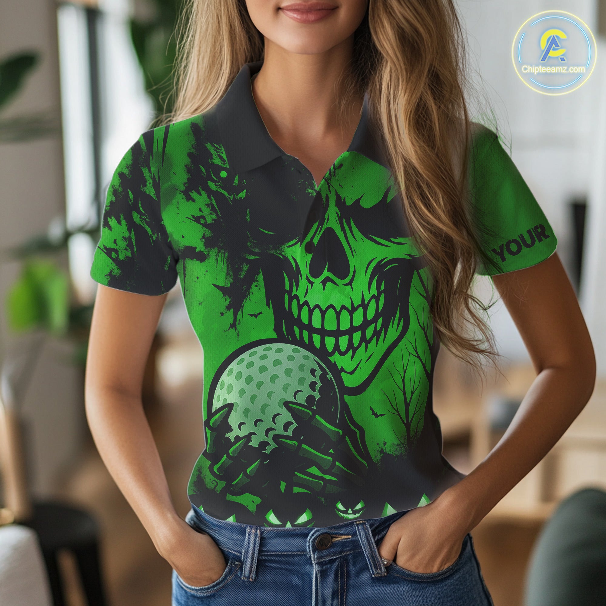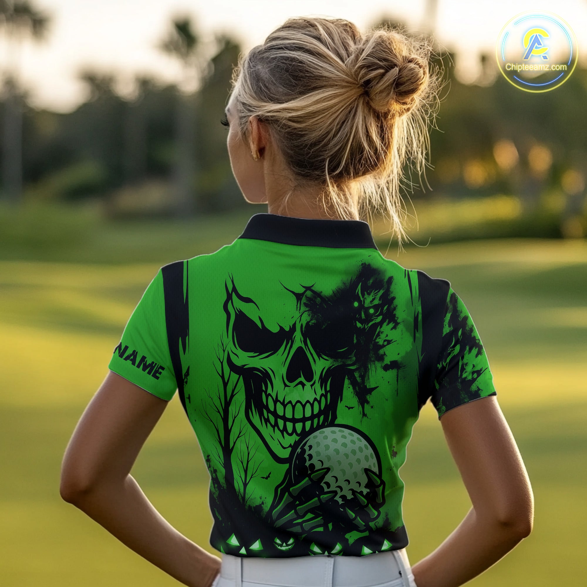Custom Skull Golf Polo Shirts For Women Halloween Golf Outfits, personalized golf gifts | Green NQS10660