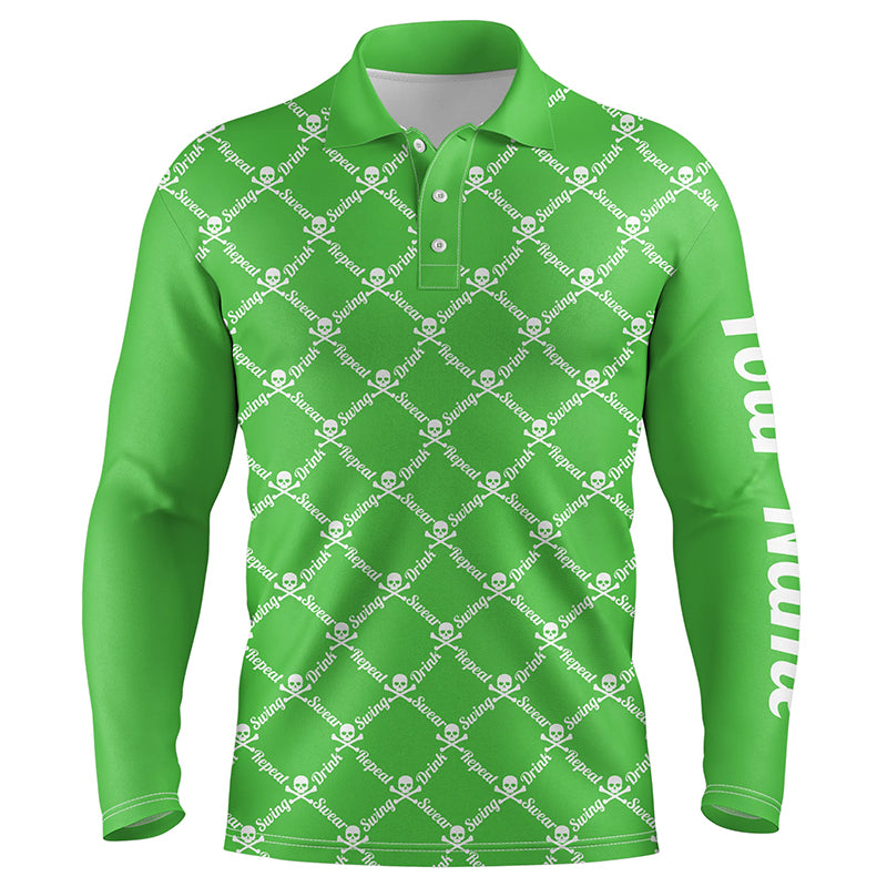 Mens golf polo shirt swing swear drink repeat golf skull custom name golf wear for mens | Green NQS4885