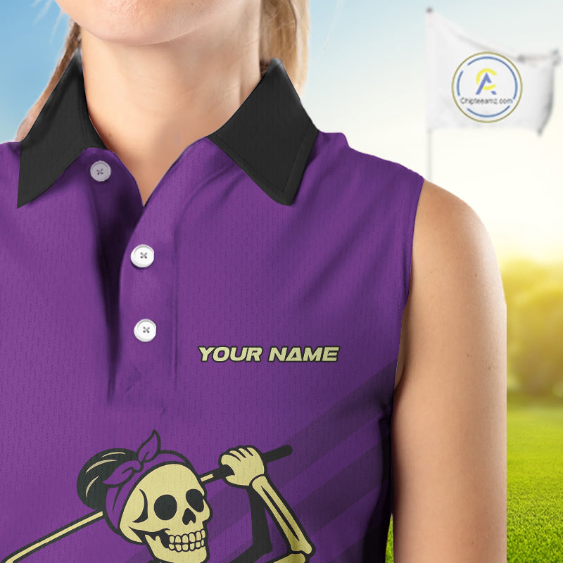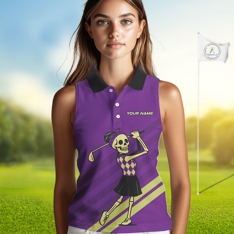 Funny argyle pattern Skull Sleeveless Polo Shirt Custom ladies golf attire, cool golf gift | Purple NQS10657