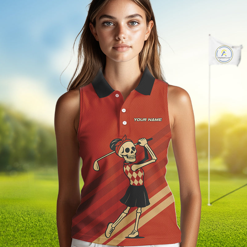 Funny argyle pattern Skull Women Sleeveless Polo Shirt Custom ladies golf attire, cool golf gift| Red NQS10251
