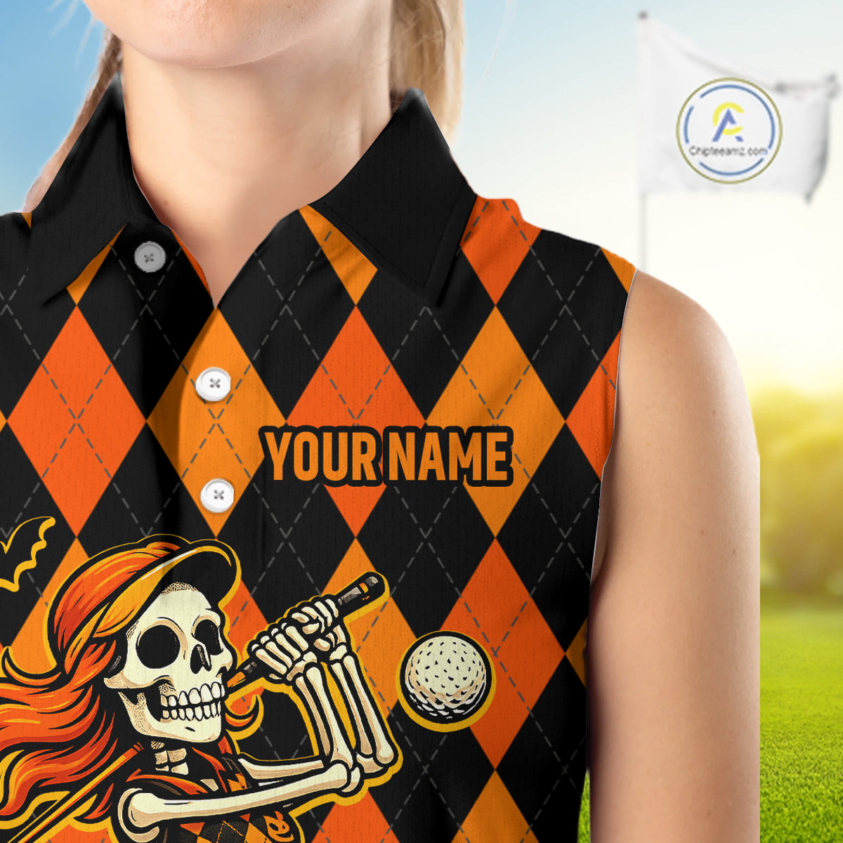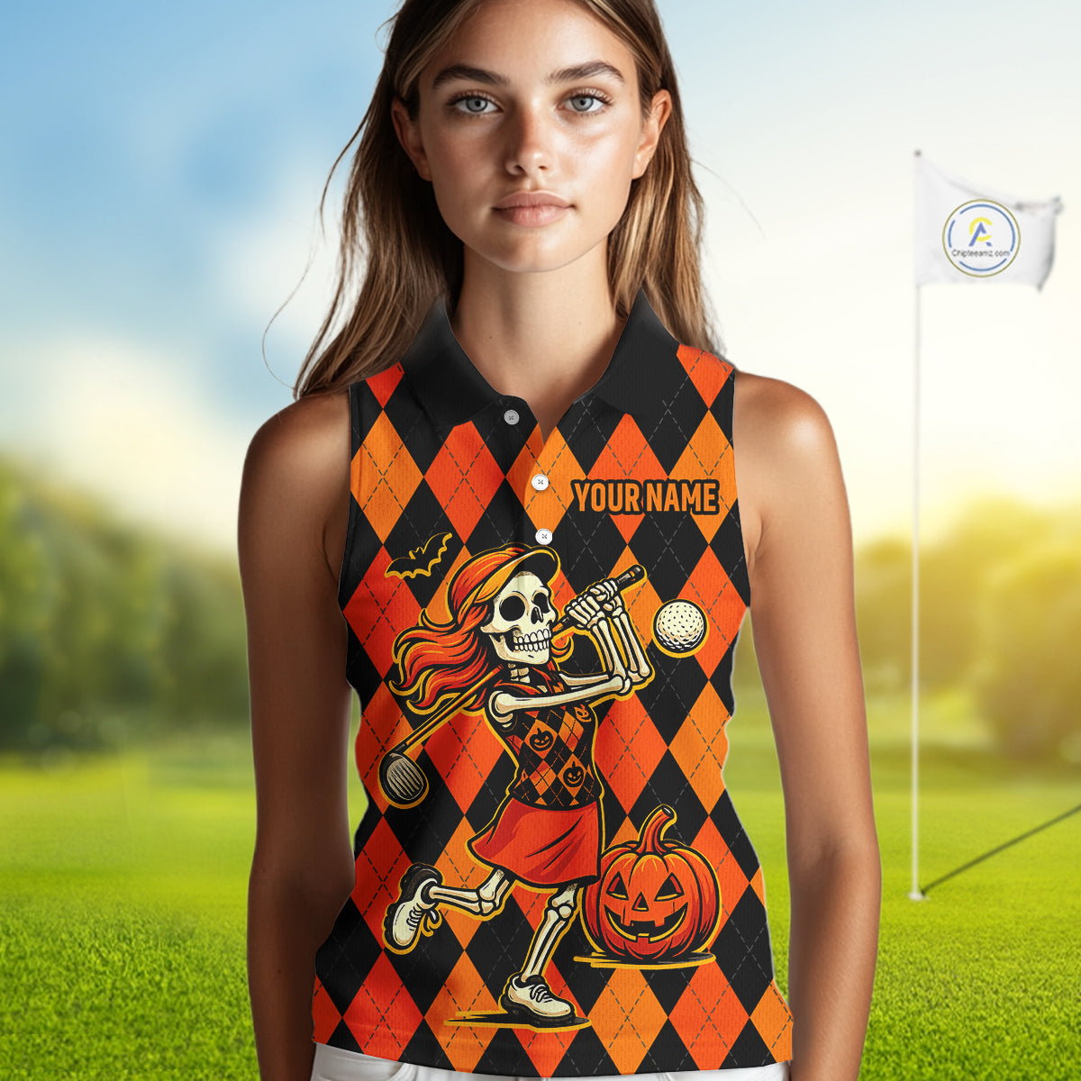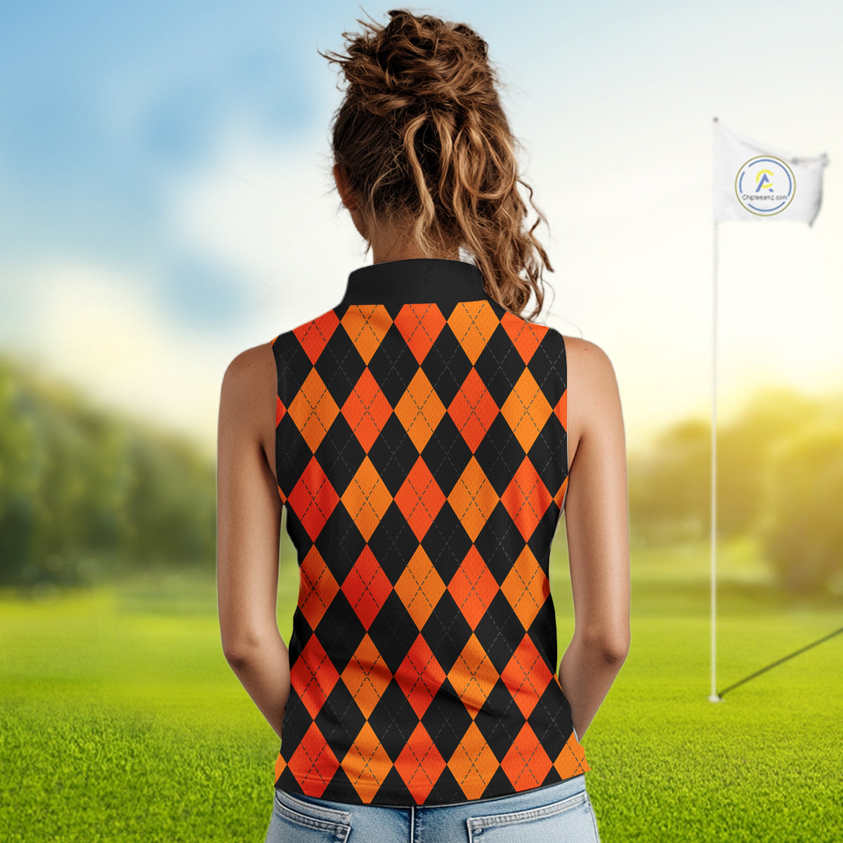 Funny Women sleeveless polo shirt custom orange black argyle plaid Halloween Skull ladies golf attire NQS10355