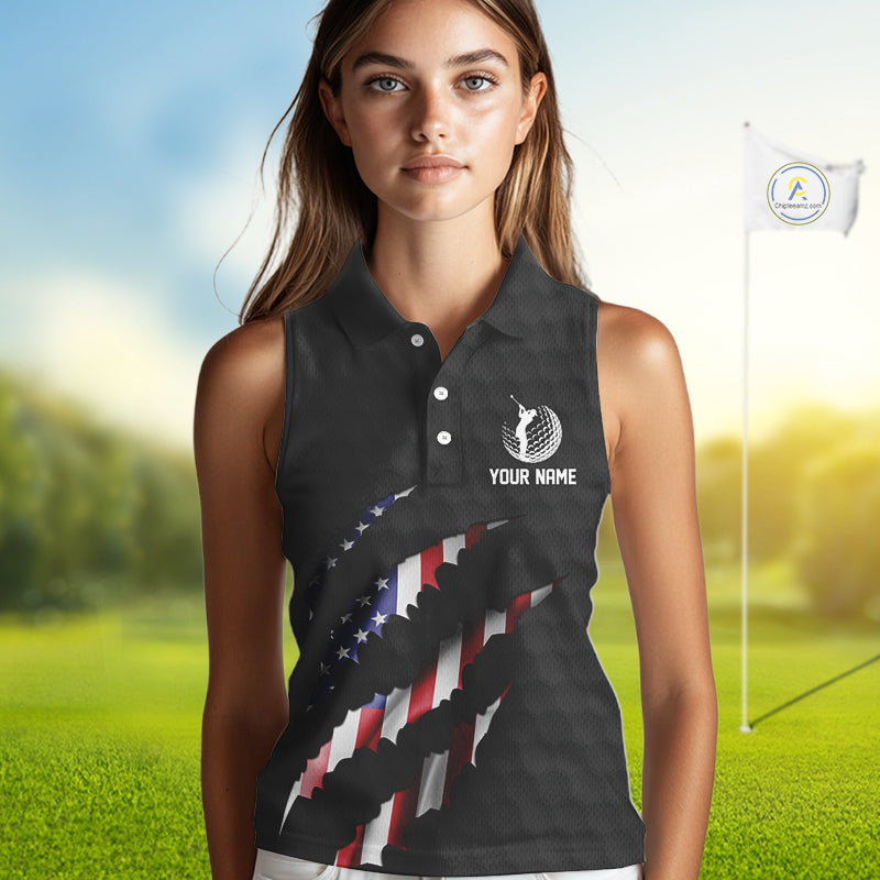 Personalized American Flag Women sleeveless polo shirt, Patriotic Golf Team Shirts For Ladies | Black NQS10178