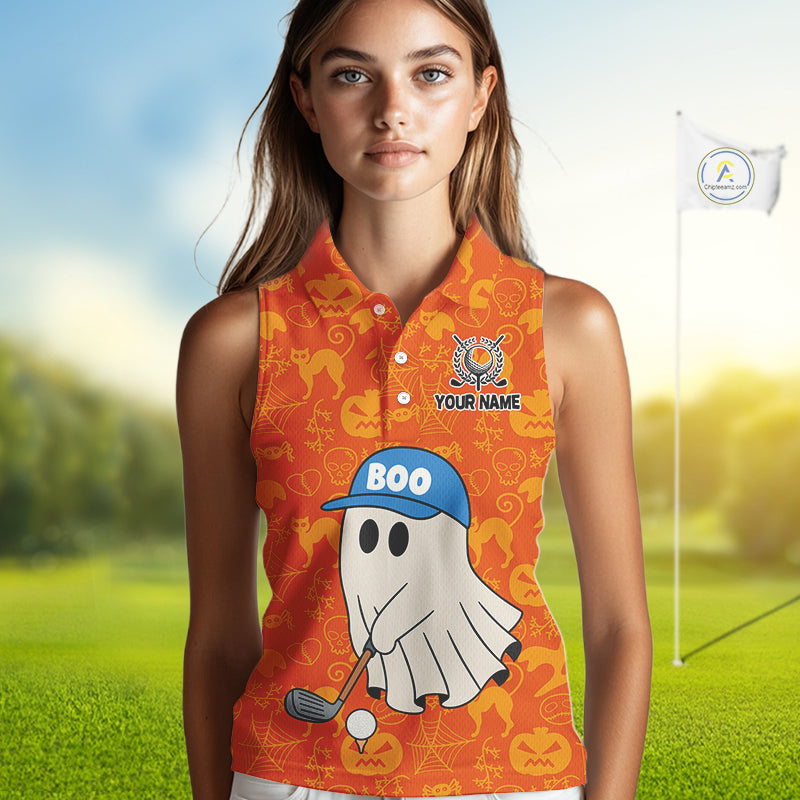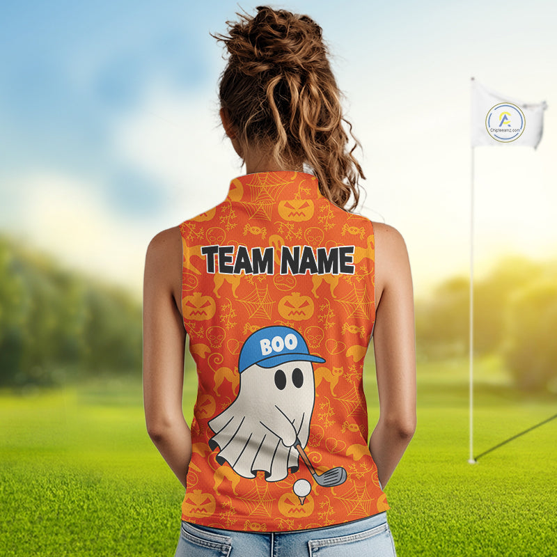 Personalized Funny Halloween Boo Orange Pattern Sleeveless Golf Polo Shirts, Halloween Golf Attire NQS10837