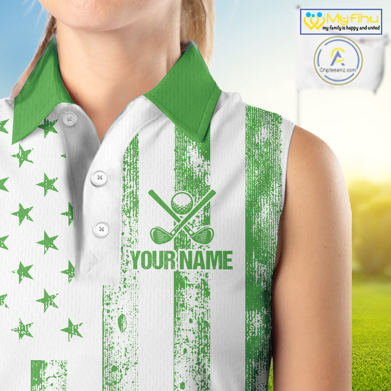 Personalized Green & White American Flag Retro Women sleeveless polo shirt Patriotic laies golf top NQS10309