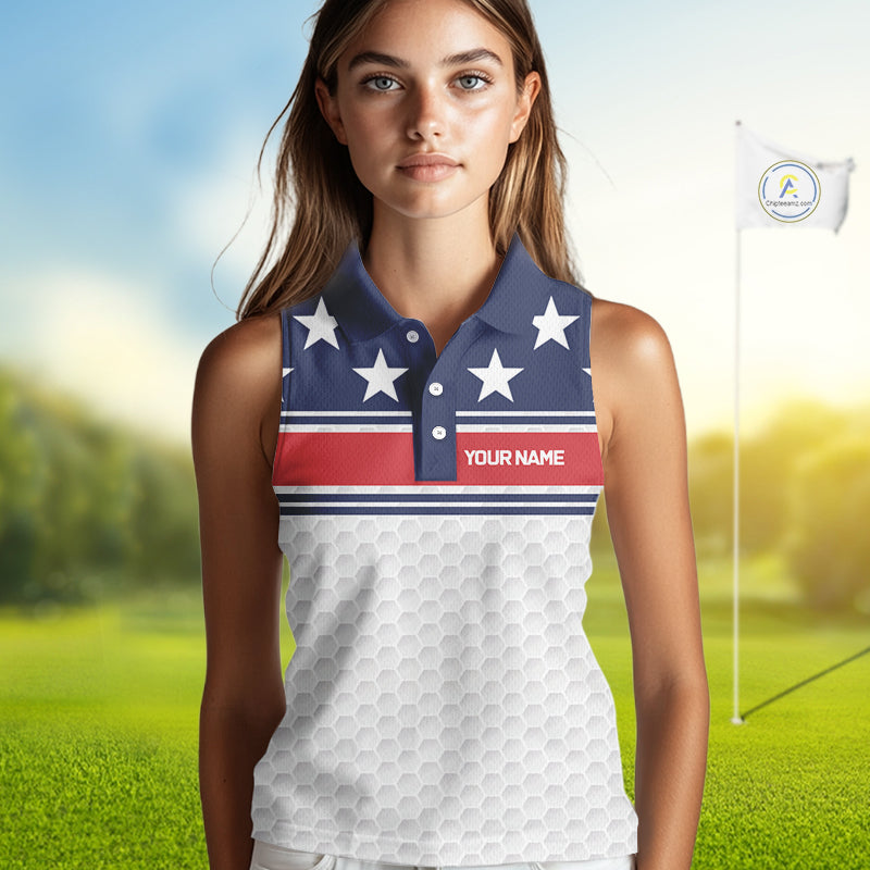 Red, White and Blue American Flag Women sleeveless golf polo shirt custom patriotic ldies golf attire NQS10006