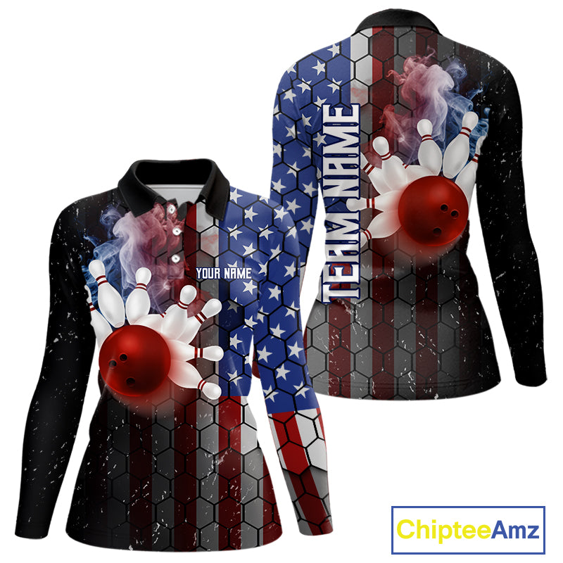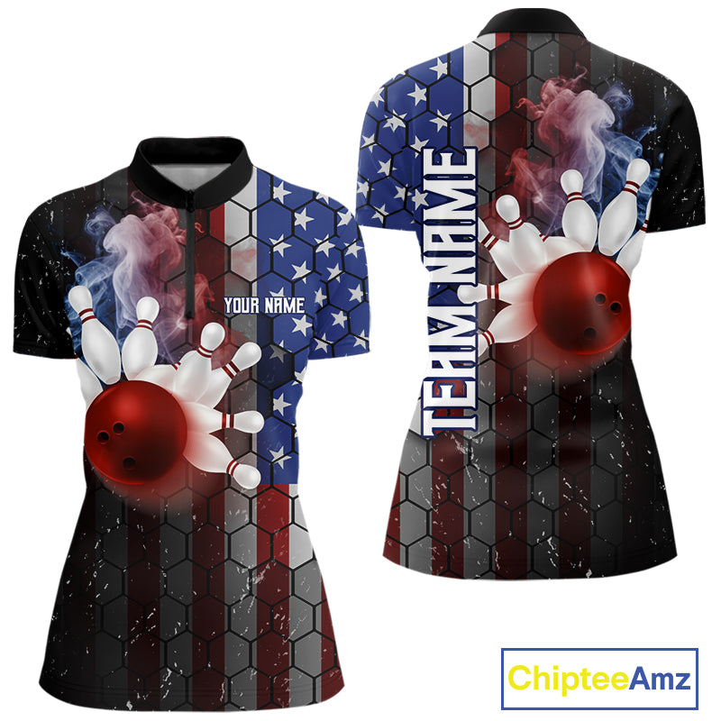 Smoke American Flag Vintage Women Bowling Polo, 1/4 Zip Shirts Custom Patriotic Bowling Team jerseys NQS9802