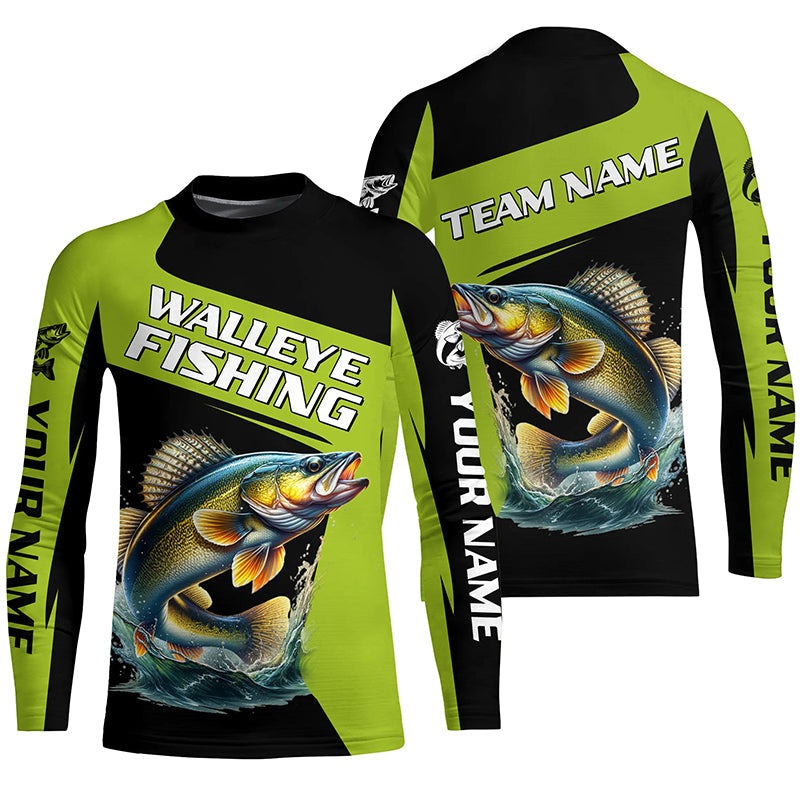 Black Green Walleye fishing Custom Long Sleeve Tournament Fishing Shirts, Performance Fishing Jerseys NQS7458