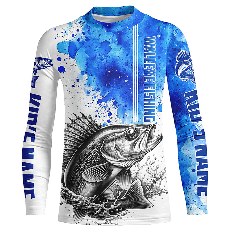 Walleye Fishing Watercolor Custom Long Sleeve Fishing Shirts, Walleye Fishing Jerseys | Blue IPHW5807