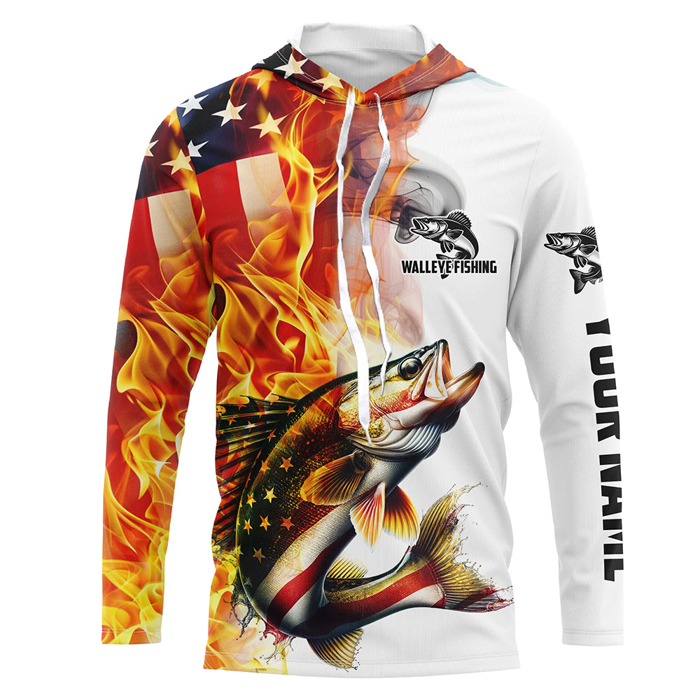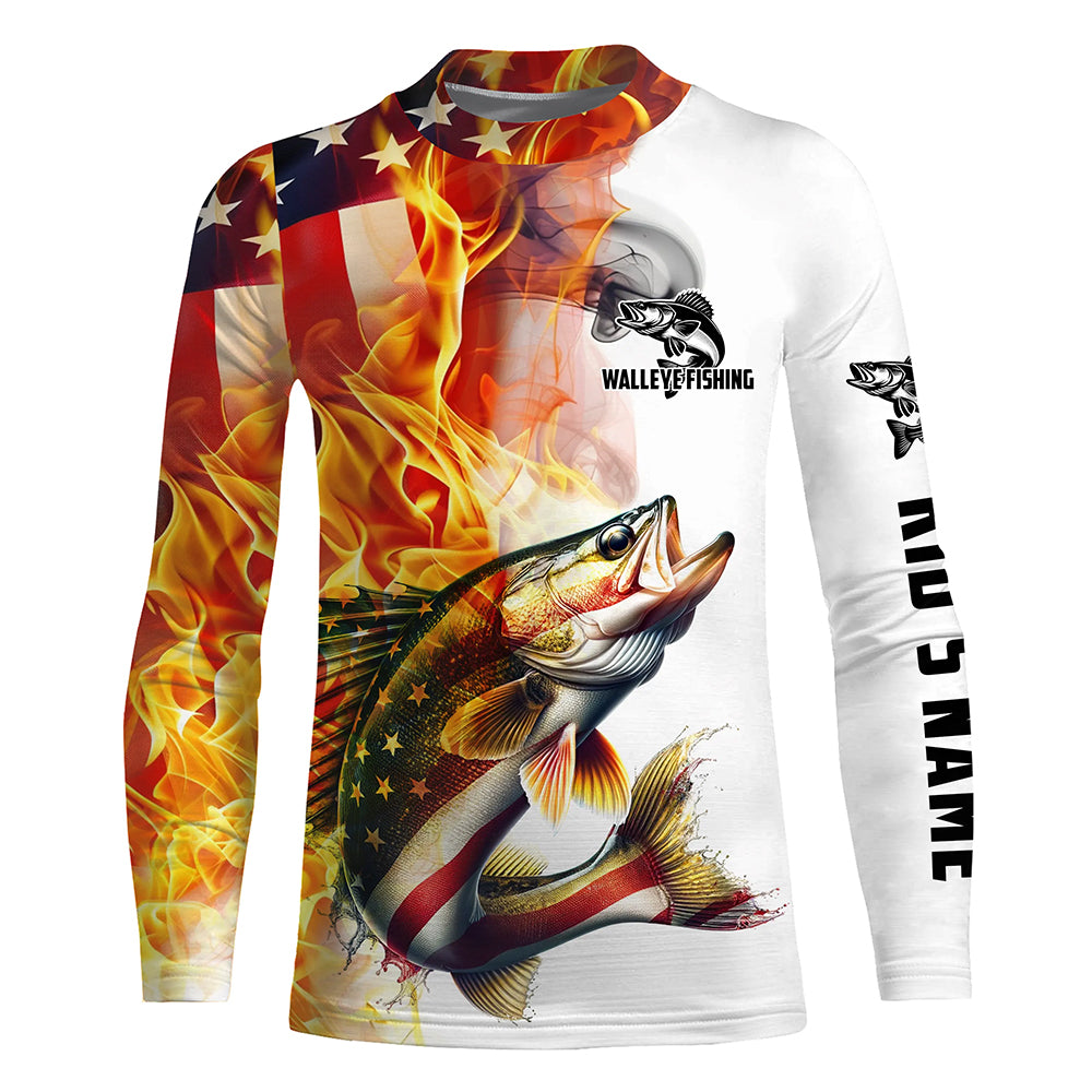 Flame American Flag Custom Walleye Fishing Shirts, Patriotic Walleye Long Sleeve Fishing Jerseys IPHW5965