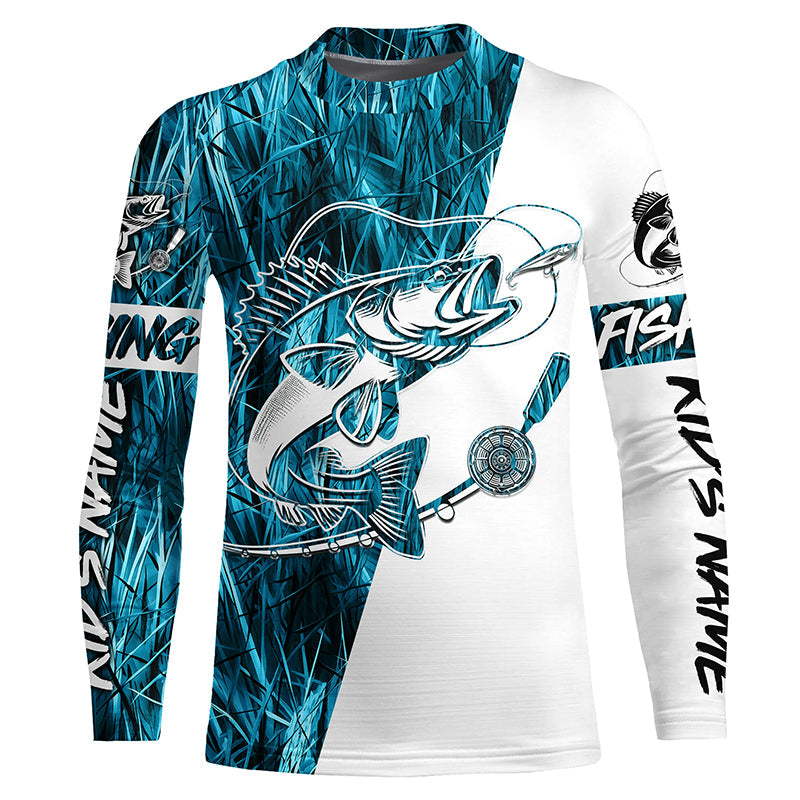 Walleye Fishing Tattoo Blue Camo Custom Long Sleeve Shirts, Walleye Tournament Fishing Jerseys IPHW6128