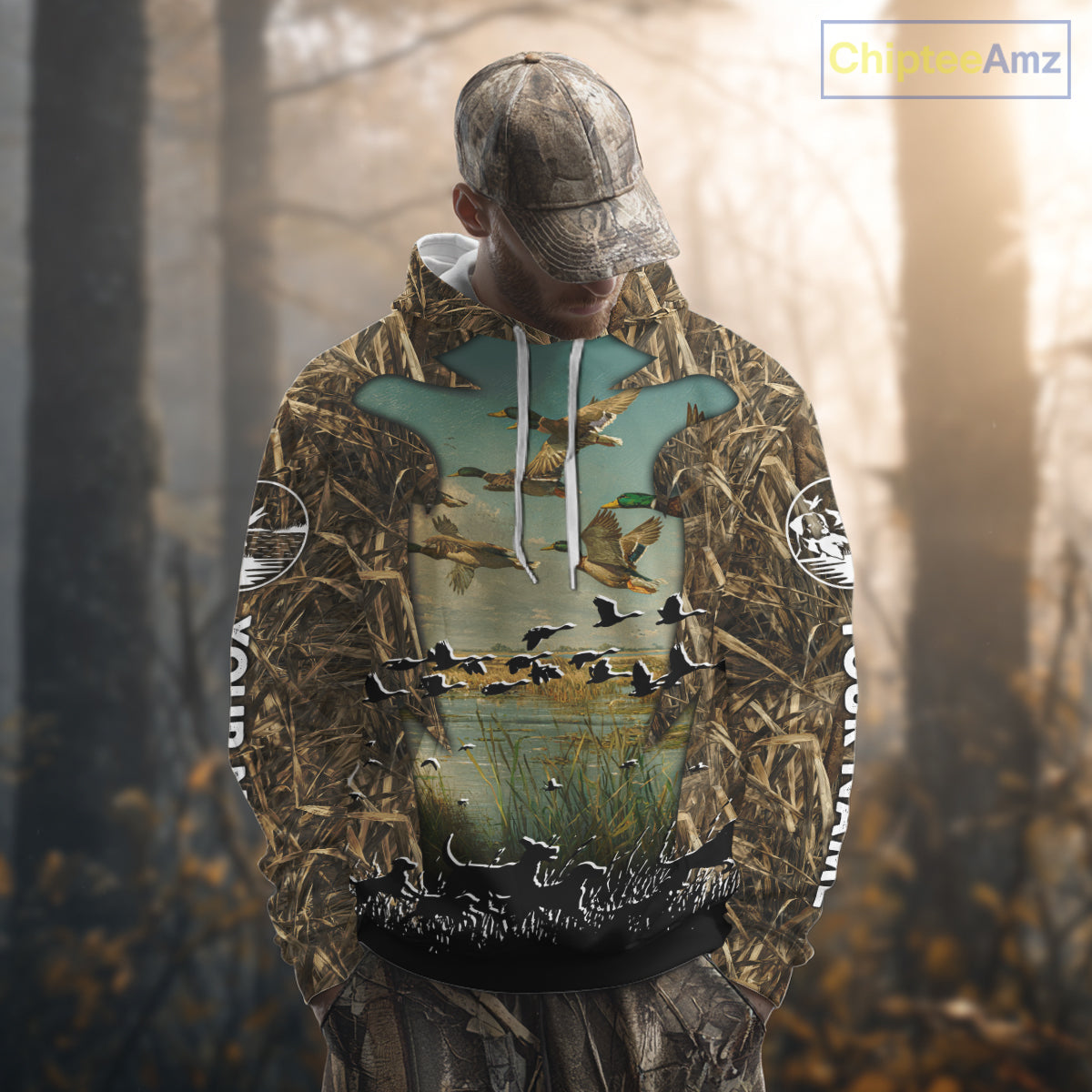 Designed for duck hunters and outdoor enthusiasts, this shirt combines style, comfort, breathability, and functionality in one. Featuring a unique waterfowl-inspired design, it can be personalized with your name, along with details like the American flag, realistic grass camo patterns, and even your loyal hunting dog – making it the perfect gift idea for hunters during duck hunting season.