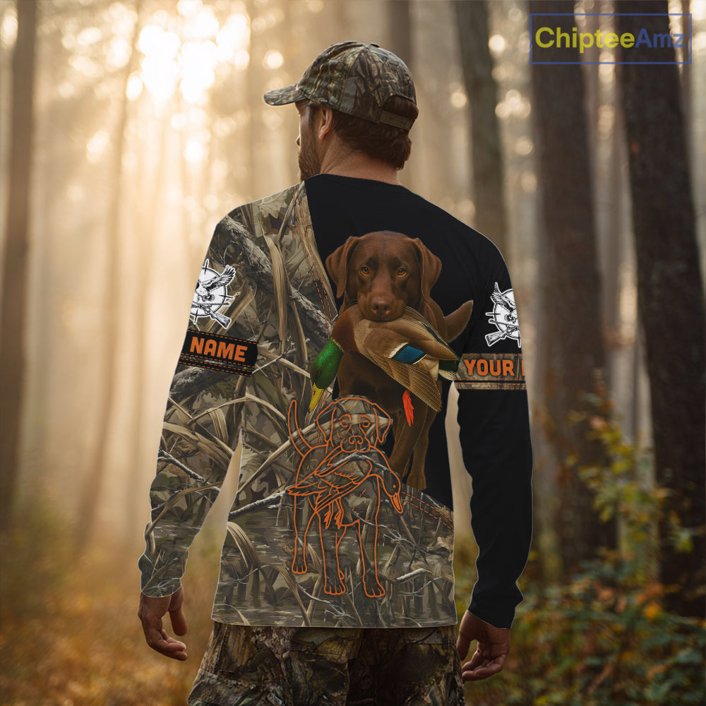Chocolate Lab Hunting Dog Customized Name All Over Print Shirts For Hunters, Duck Hunting NHT275