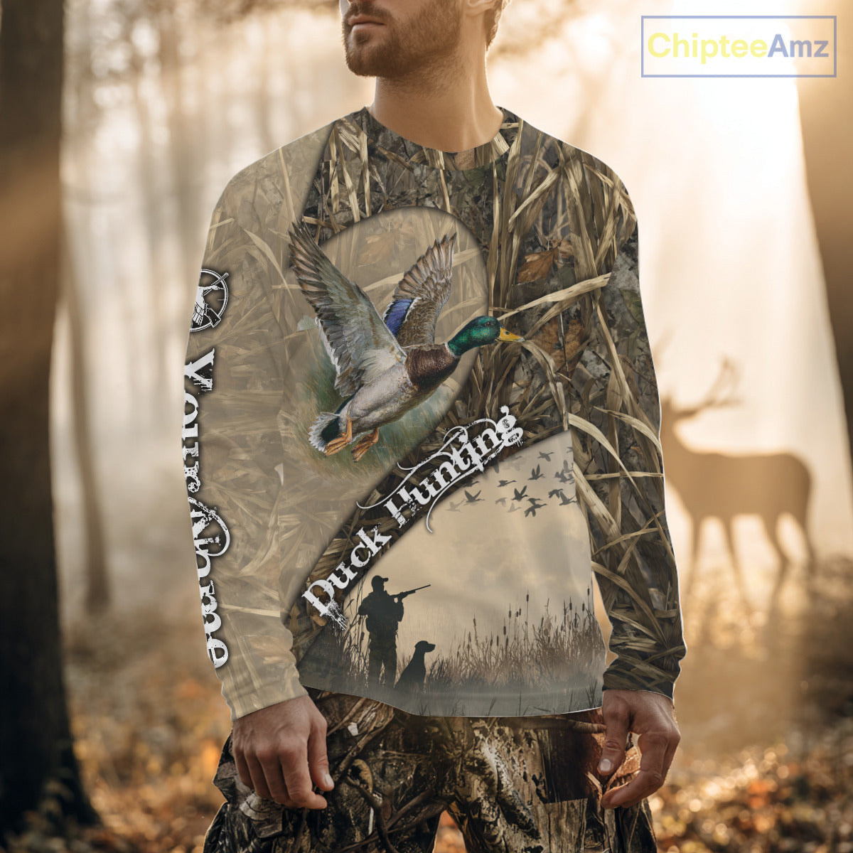 Designed for duck hunters and outdoor enthusiasts, this shirt combines style, comfort, breathability, and functionality in one. Featuring a unique waterfowl-inspired design, it can be personalized with your name, along with details like the American flag, realistic grass camo patterns, and even your loyal hunting dog β making it the perfect gift idea for hunters during duck hunting season.
