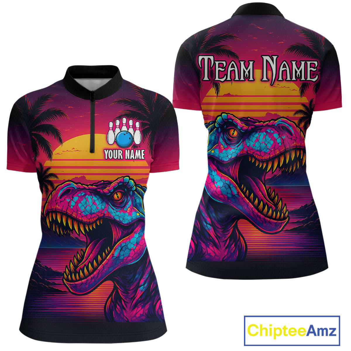 Custom Neon Dinosaur Bowling Women Bowling Shirt Polo & Quarter-Zip Bowling Team Jerseys HNT78
