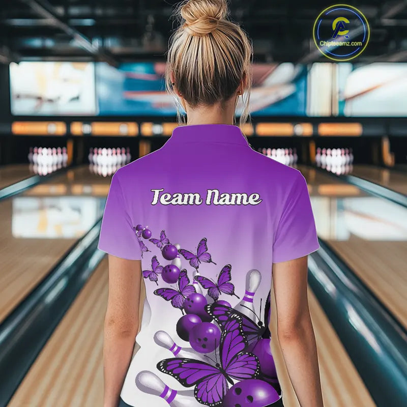 Custom Purple Gradient Butterfly Bowling Women Polo Shirts For Team, Bowling League Shirt IPHW9006