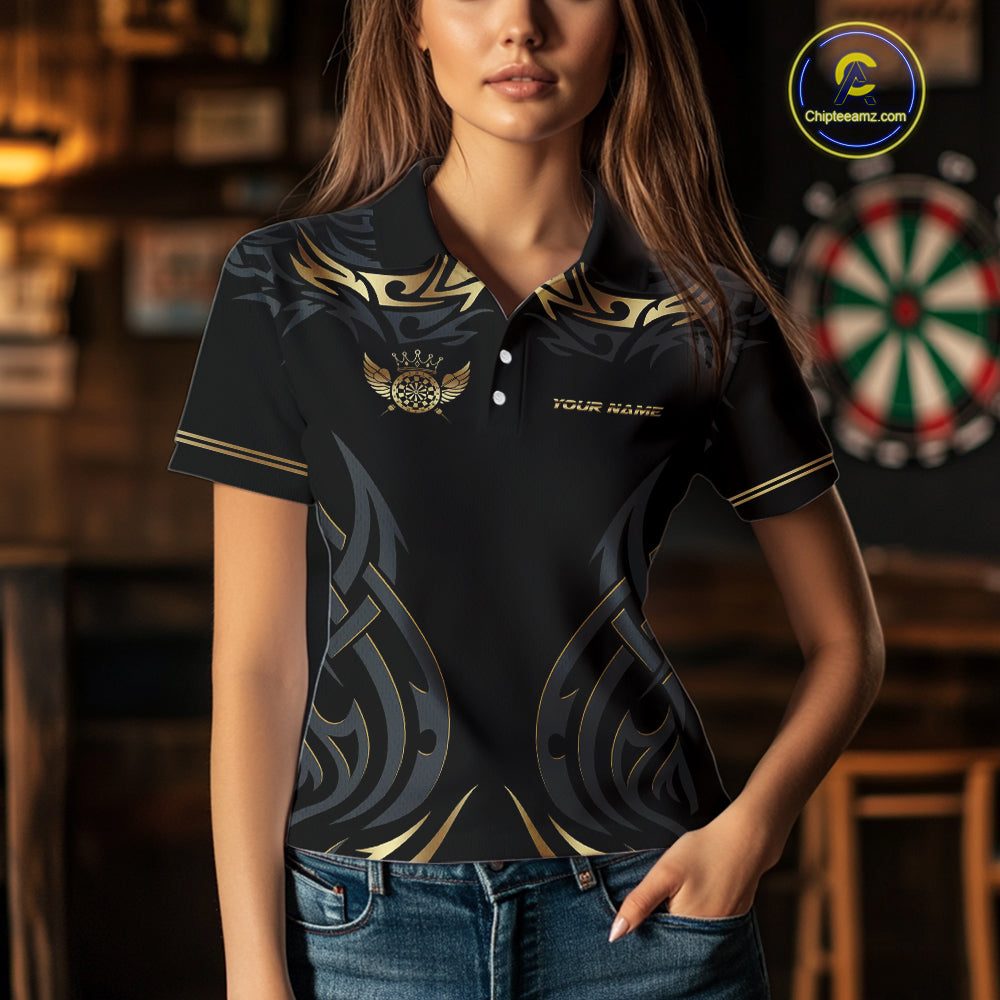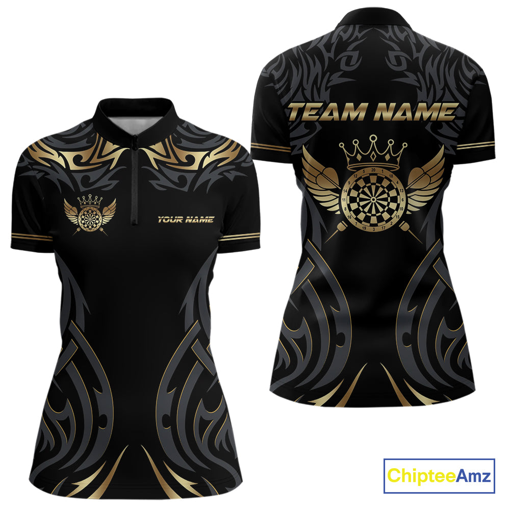 Black And Gold Dartboard Crown Wings Custom Darts Shirt For Women, Darts Team Jerseys Polo & 1/4 Zip TDM4420