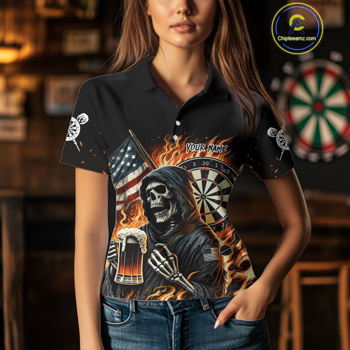 Flaming Grim Reaper Beer Darts Shirt Custom US Flag Darts Polo & Quarter Zip Jerseys For Women TDM4526