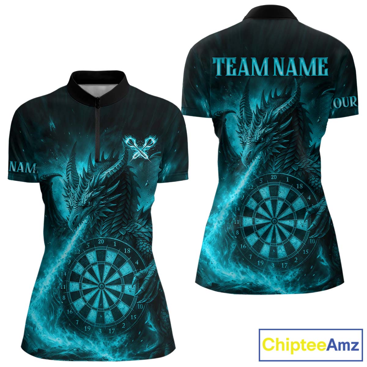 Turquoise Flaming Dragon Darts Jersey For Women Custom Polo & Quarter Zip Darts League Team Shirt TDM4587