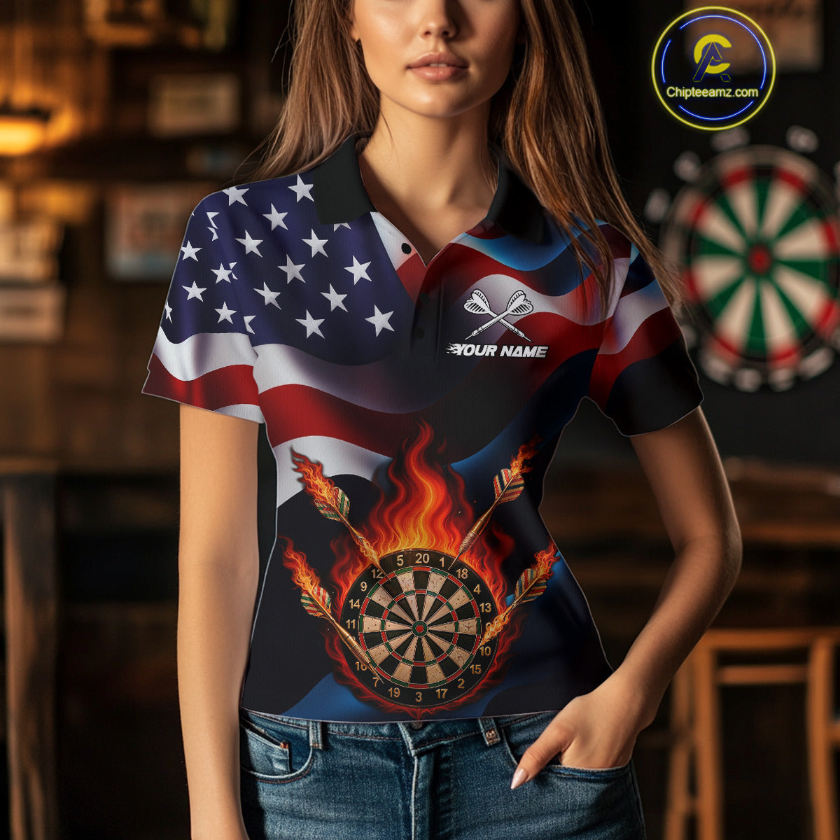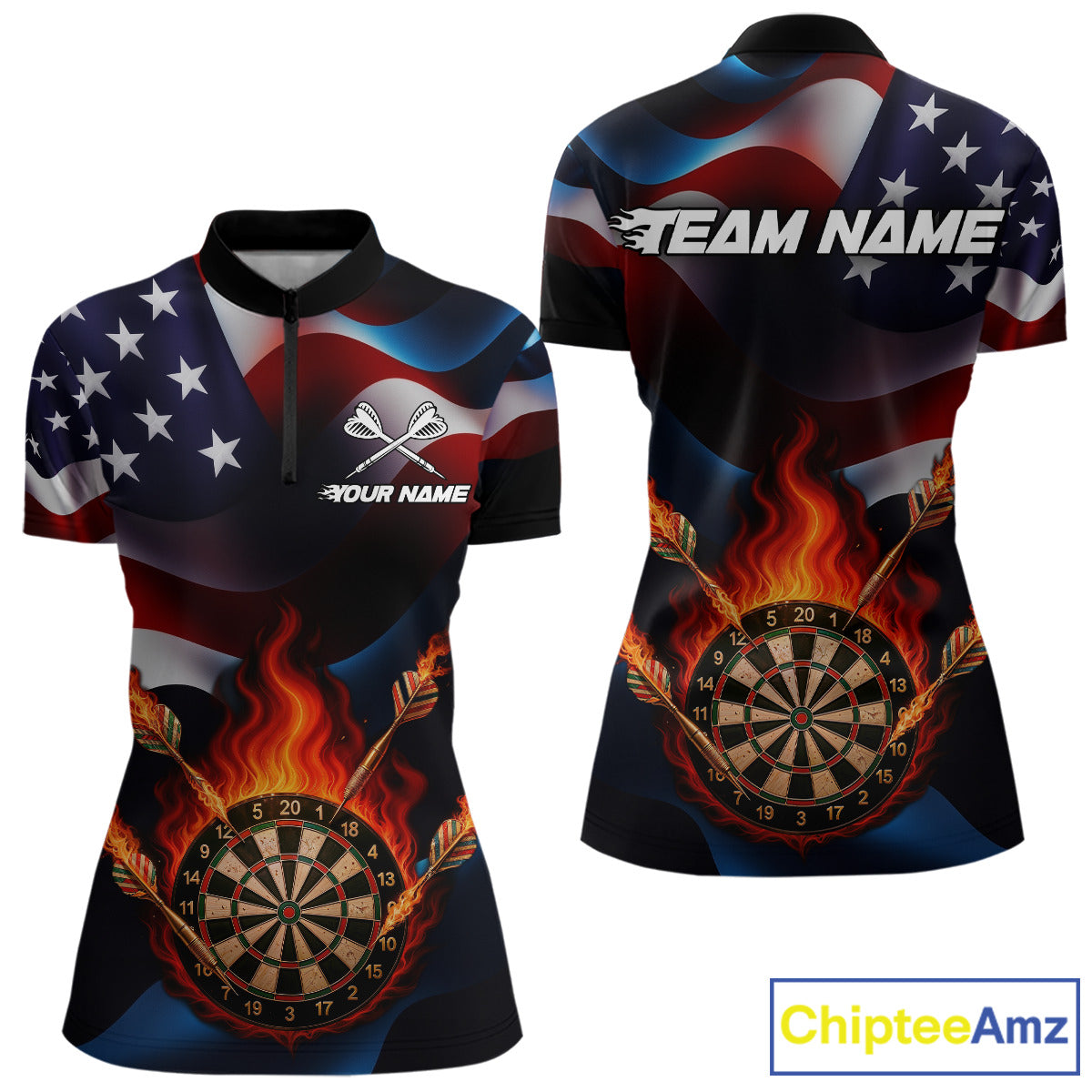 Personalized Flaming Dartboard American Flag Darts Shirt For Women Custom Patriotic Dart Team Jersey TDM4682