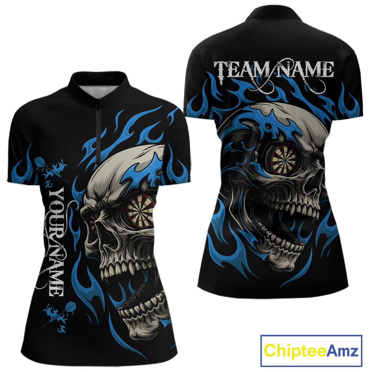 Personalized Blue Flaming Skull Darts Shirt For Women Custom Darts Jersey Team Polo & 1/4 Zip TDM4765