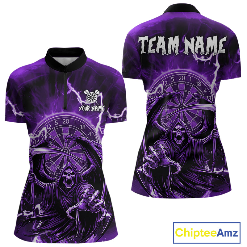Purple Grim Reaper Lightning 3D Darts Shirt For Women Custom Darts Jersey Team Polo & 1/4 Zip TDM4952