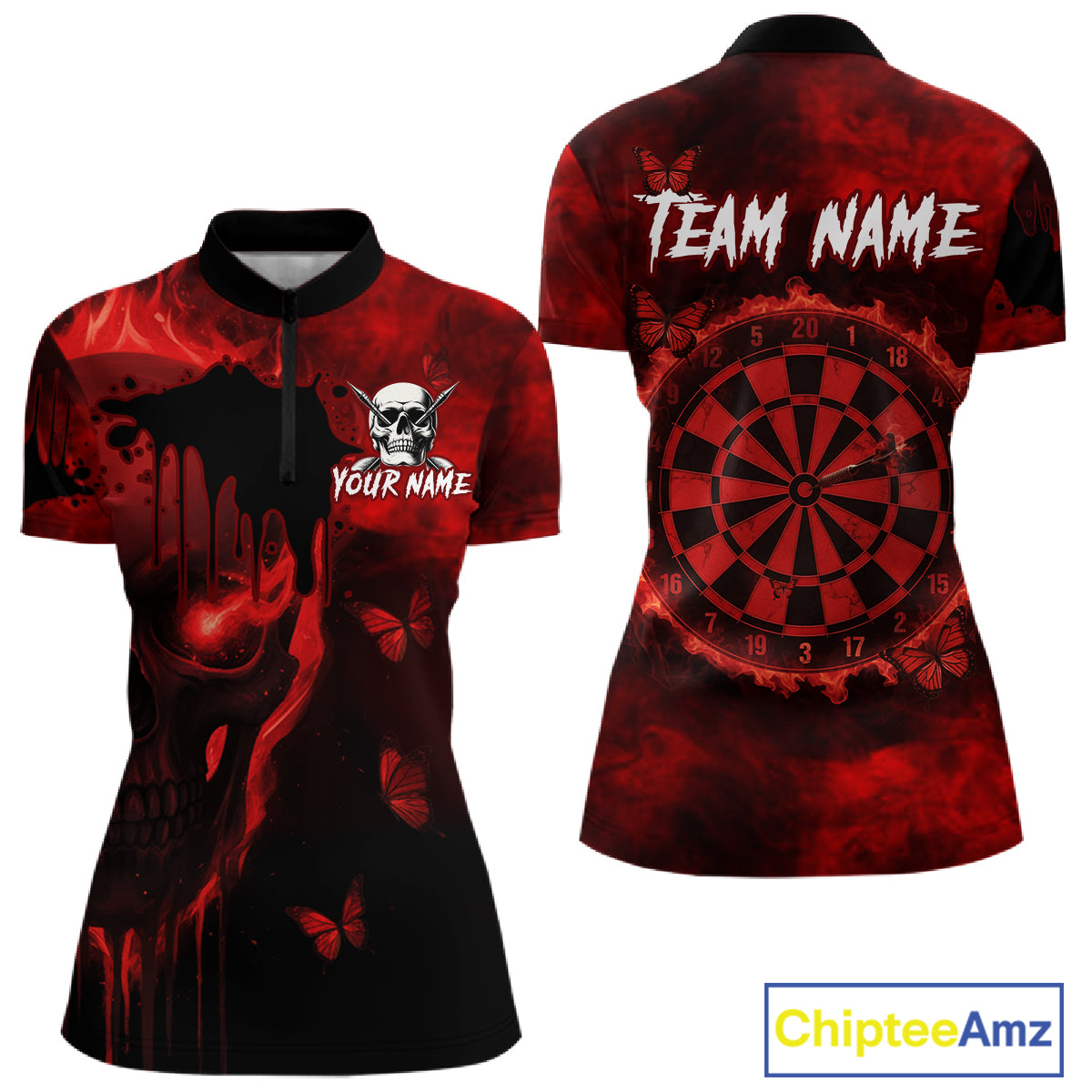 Black And Red Grunge Skull Butterflies Darts Shirt For Women Custom Darts Jersey Team Polo & 1/4 Zip TDM4992