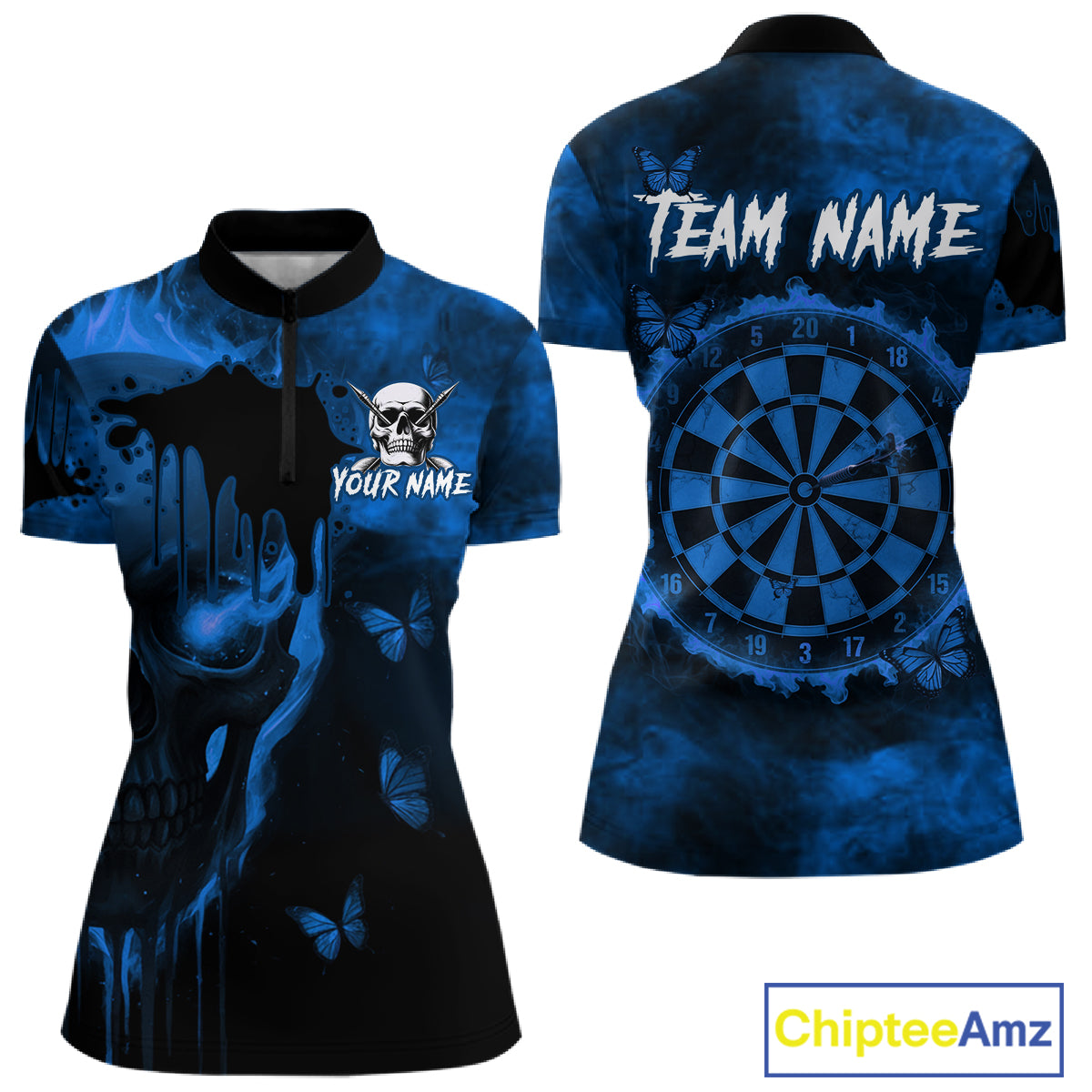 Black And Blue Grunge Skull Butterflies Darts Shirt For Women Custom Dart Jersey Team Polo & 1/4 Zip TDM4993