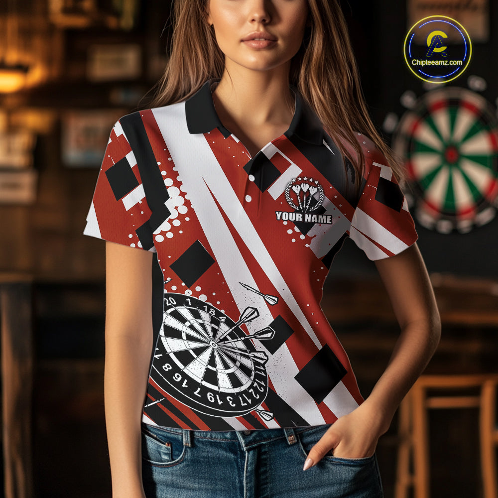 Custom Red Geometric Darts Polo & Quarter Zip For Women, Personalized Darts Team Jersey Outfit TDM5026