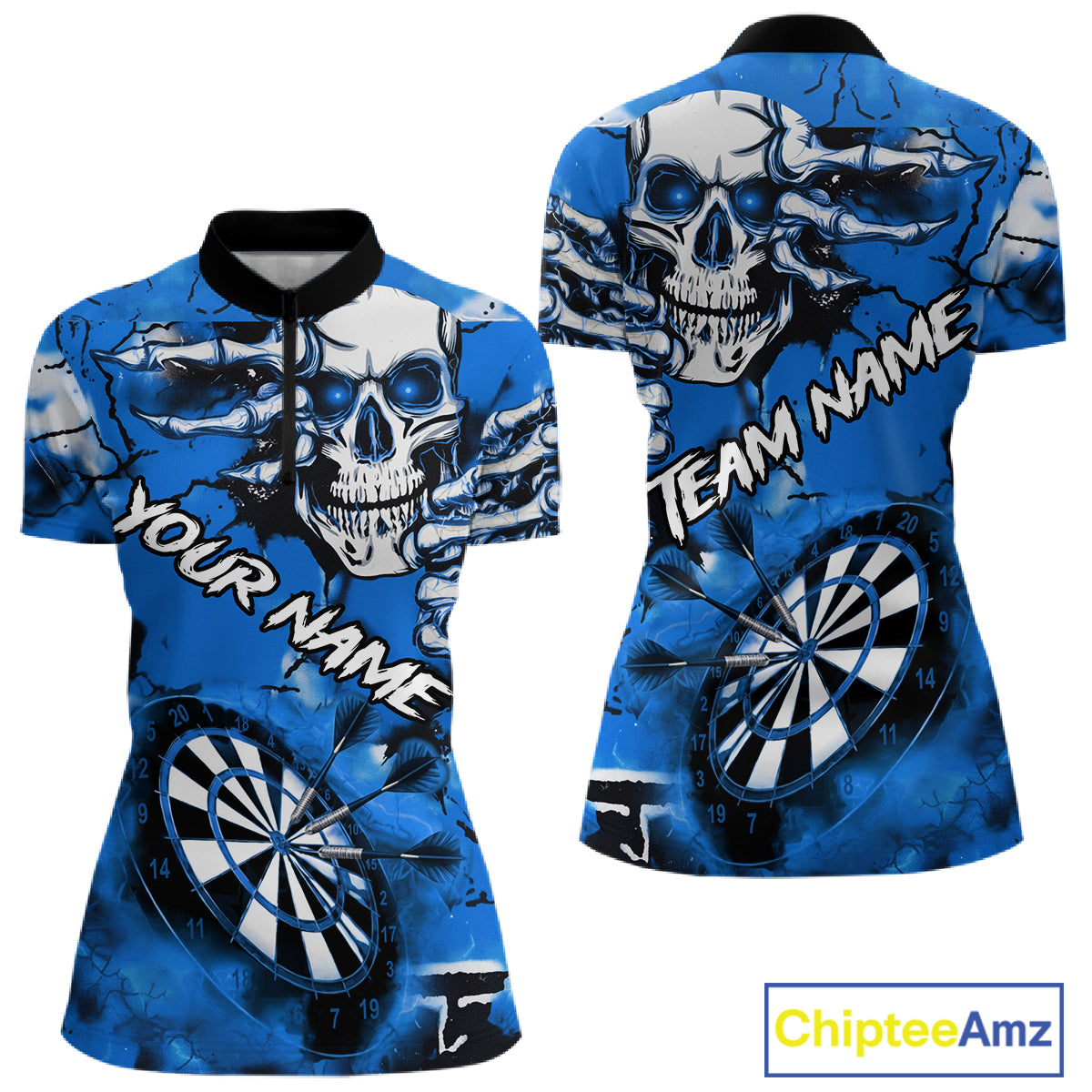Personalized Blue Grunge Skull Darts Shirt For Women Custom Darts Team Jersey Polo & Quarter Zip TDM5029