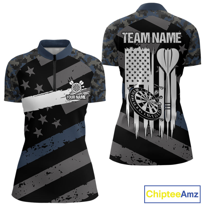 Blue Camo American Flag Darts Shirt For Women Custom Patriotic Darts Jersey Team Polo & 1/4 Zip TDM5034