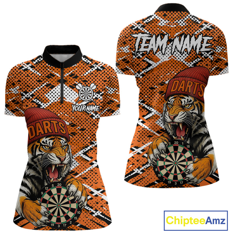 Personalized Orange Black Grunge Tiger Darts Shirt For Women Custom Darts Team Jersey Polo & 1/4 Zip TDM5099